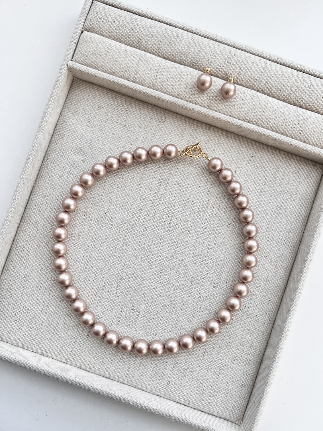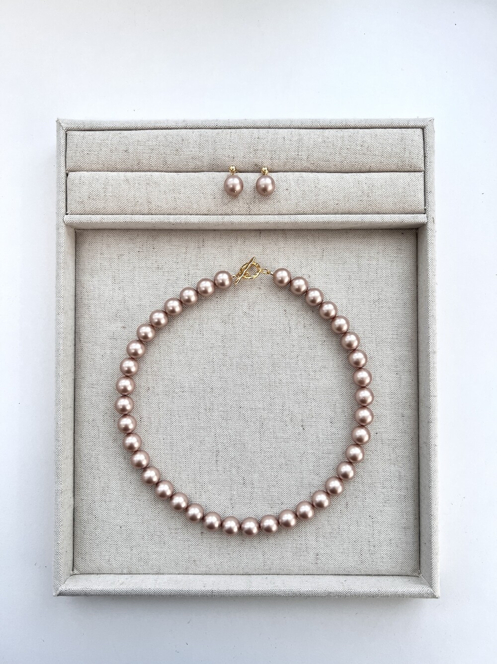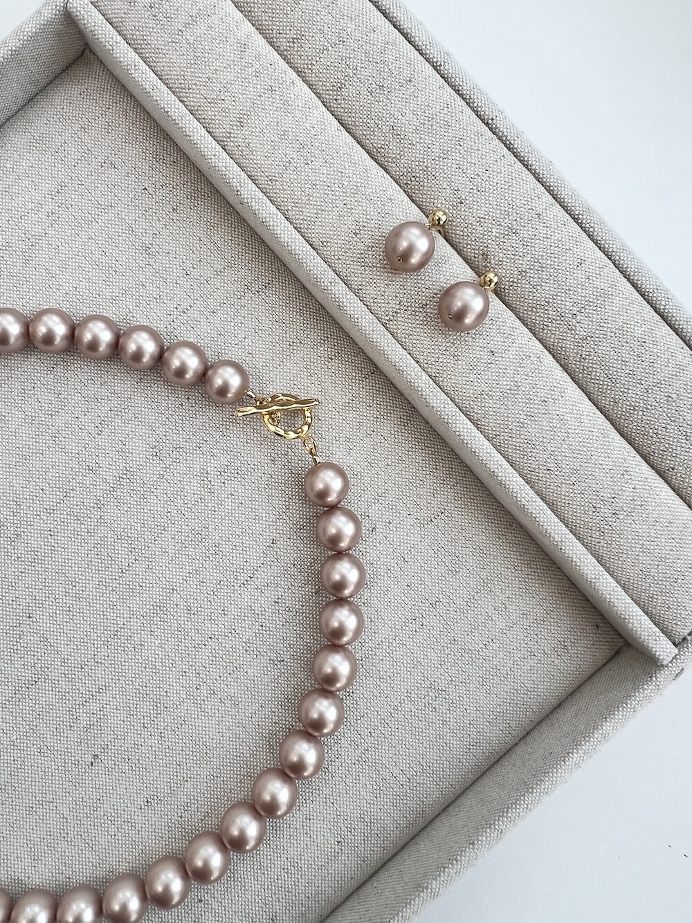 희귀한 스와로브스키 진주 10mm 사이즈로 제작된 아몬드 컬러의 진주목걸이와 귀걸이 세트입니다.