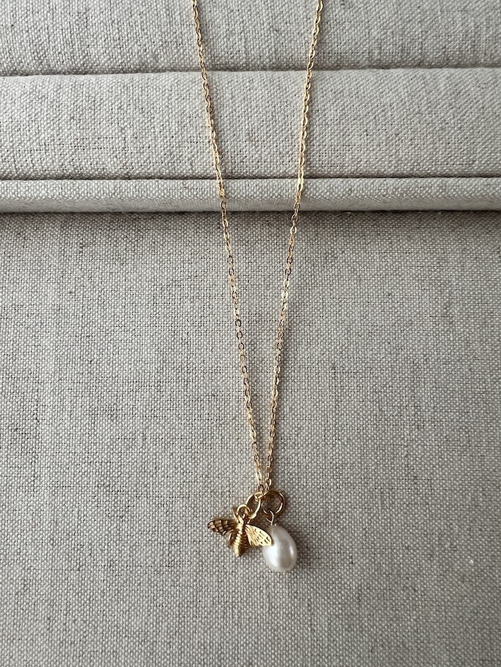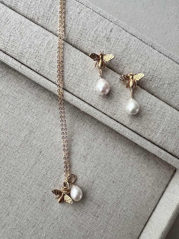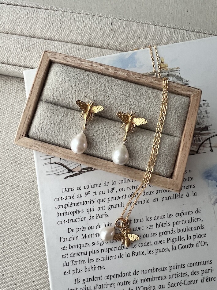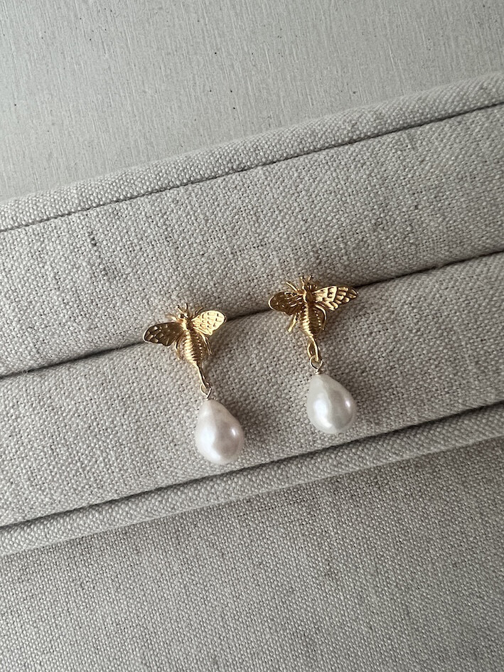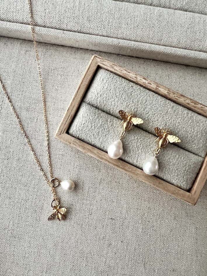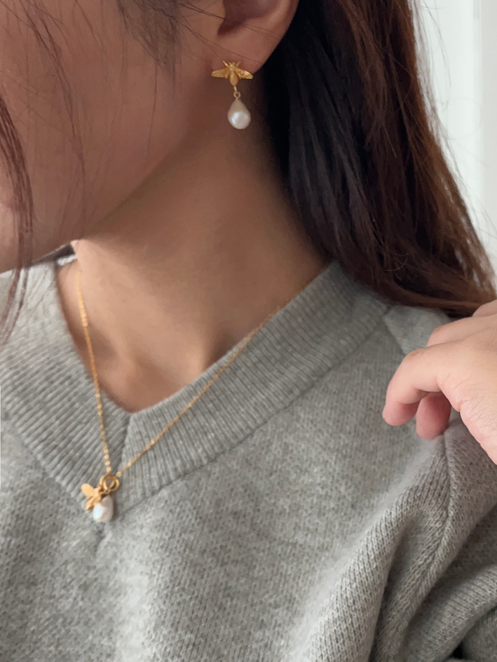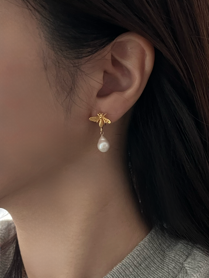 정교한 세공의 꿀벌 형태 포스트에 네추럴한 느낌을 그대로 담고 있는 천연 진주를 드랍형으로 매칭한 귀걸이 입니다.