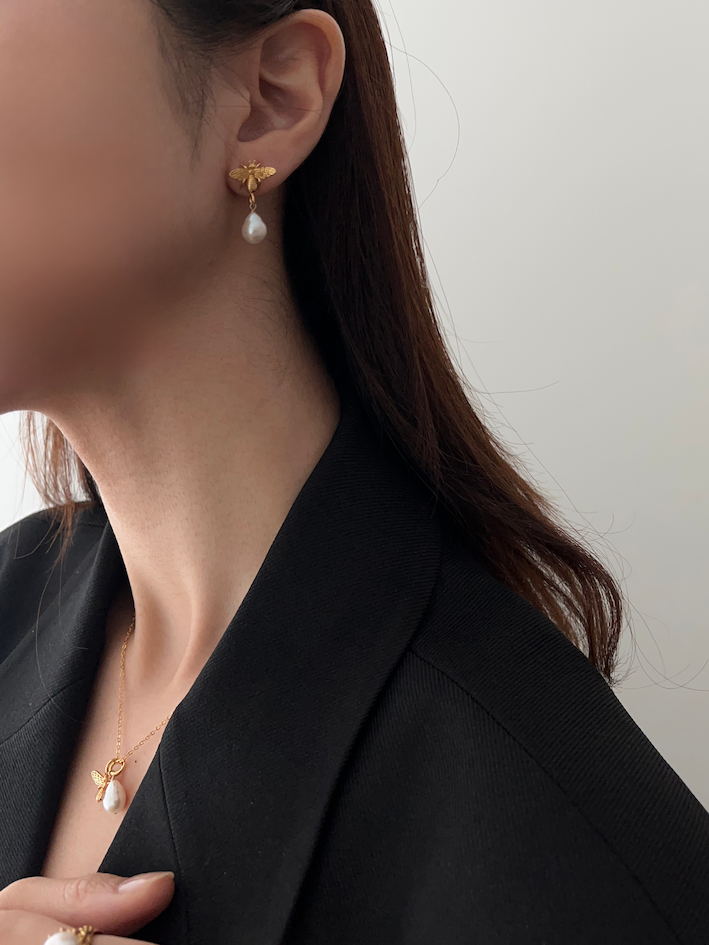 귓볼에 안정적으로 벌 형태의 귀걸이 바디가 고정되고 포스트 아랫쪽으로 진주가 내려와 움직임에 따라