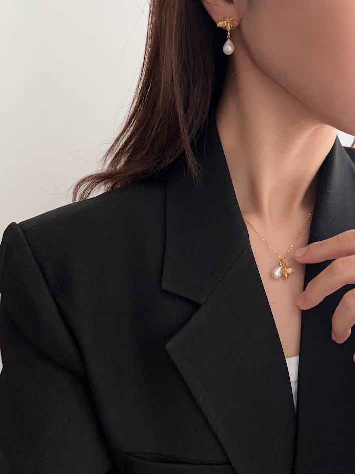 벌 모양의 귀걸이 본체에서 자연스럽게 흘러내려오는 듯한 밸런스 좋은 디자인이 특징입니다.