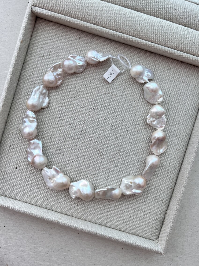 이러한 바로크 진주들은 한줄에 15개 내외로 구성되어 줄로 판매가 되는데 보통 무게로 측정하여 값을 산정합니다.