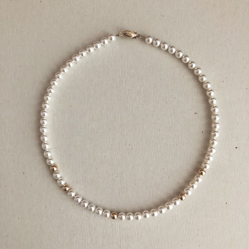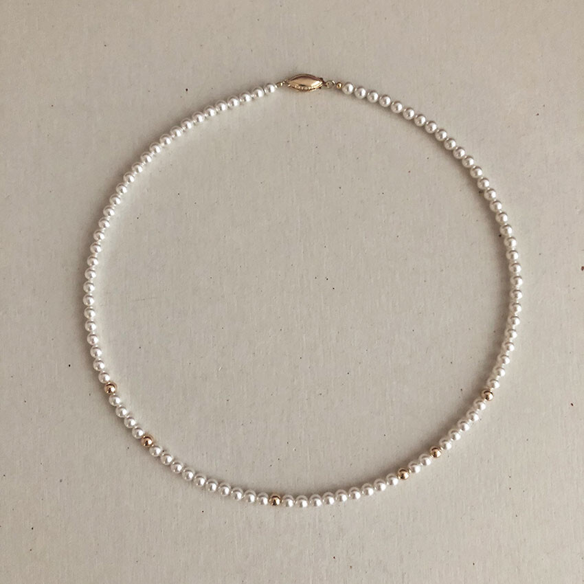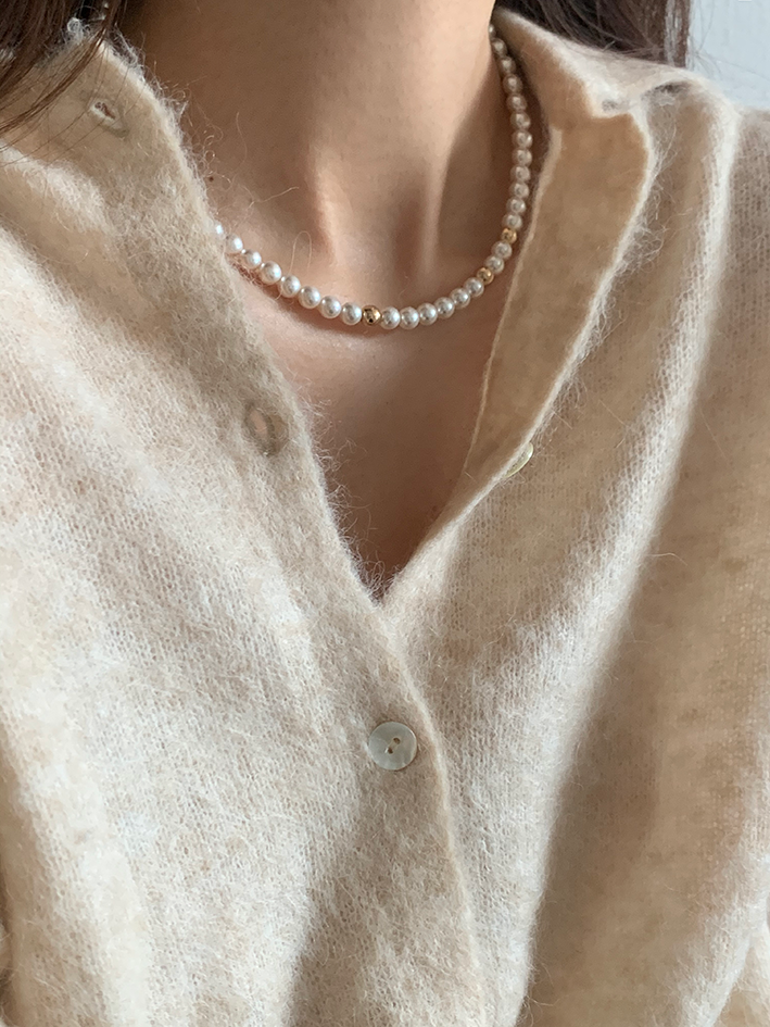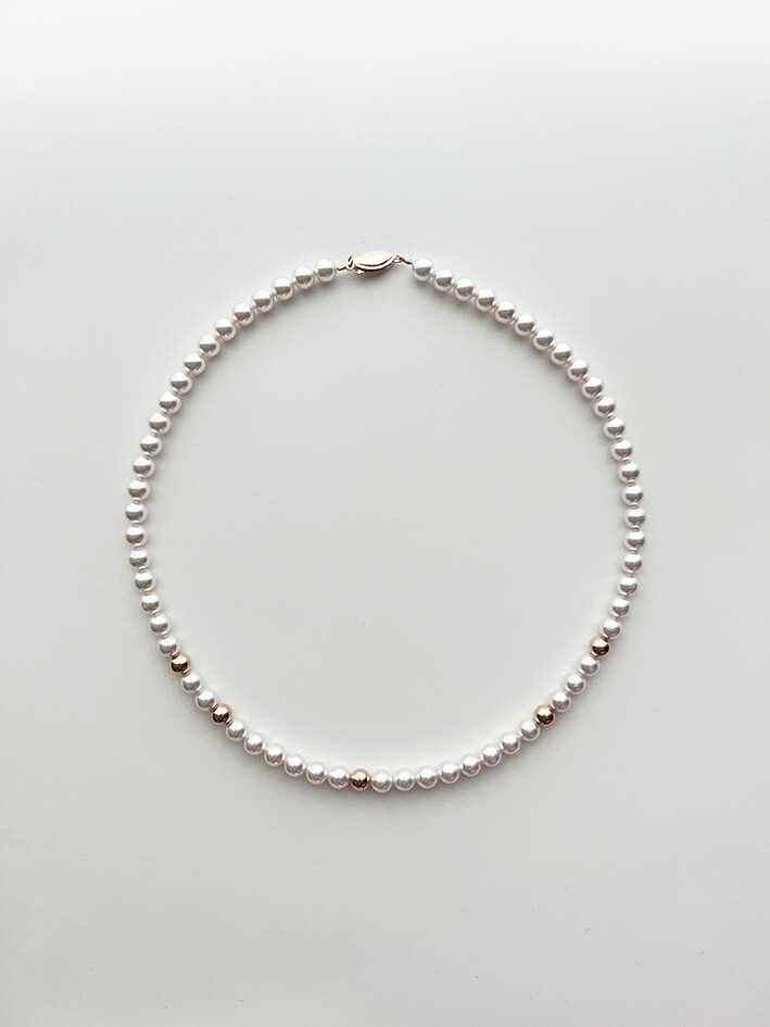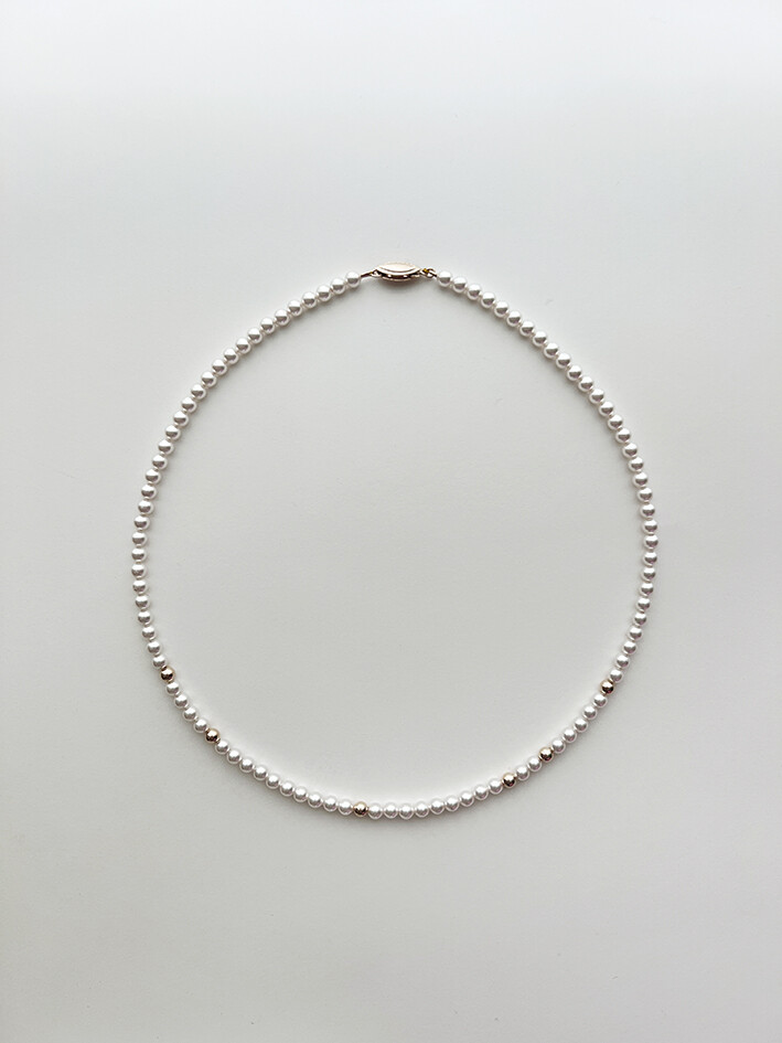 중간 중간 랜덤하게 배치된 골드볼이 다소 지루해 보일 수 있는 진주목걸이의 우아한 감성에 재미를 주는 역할을 합니다.