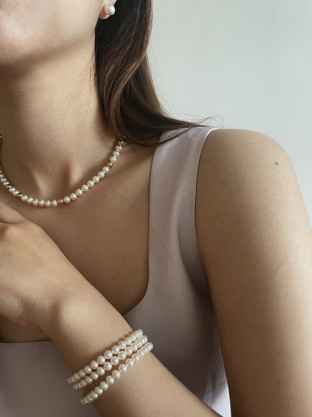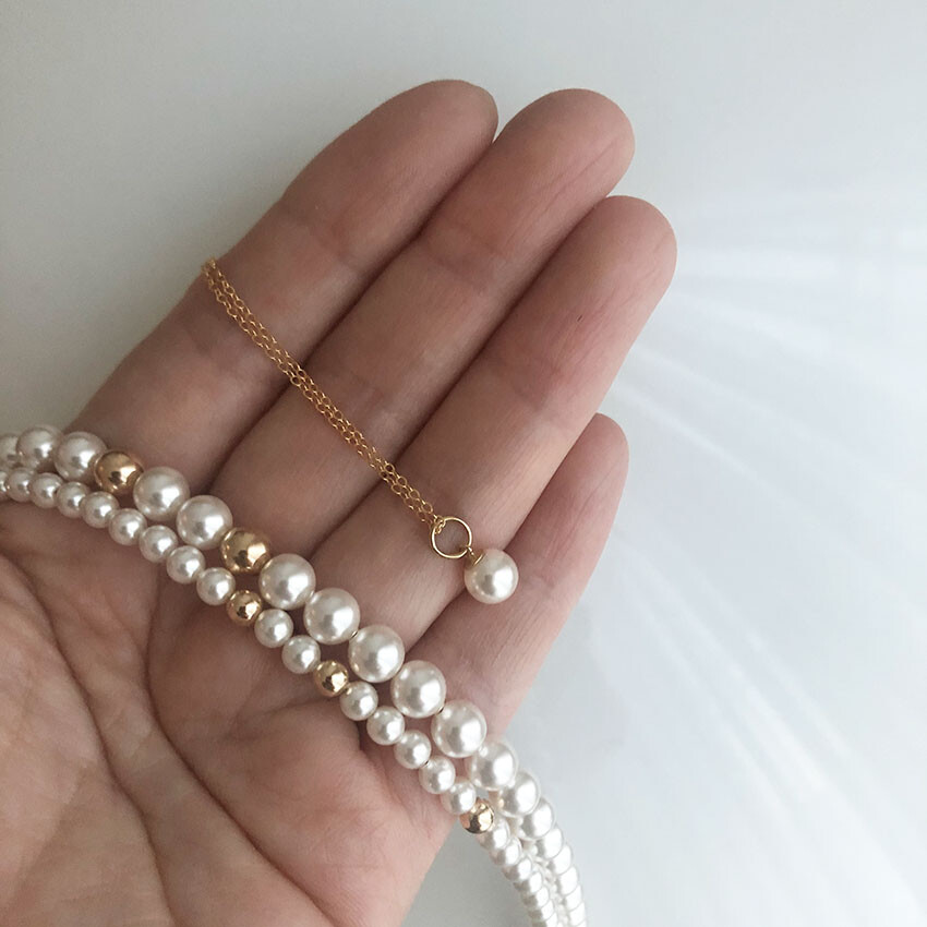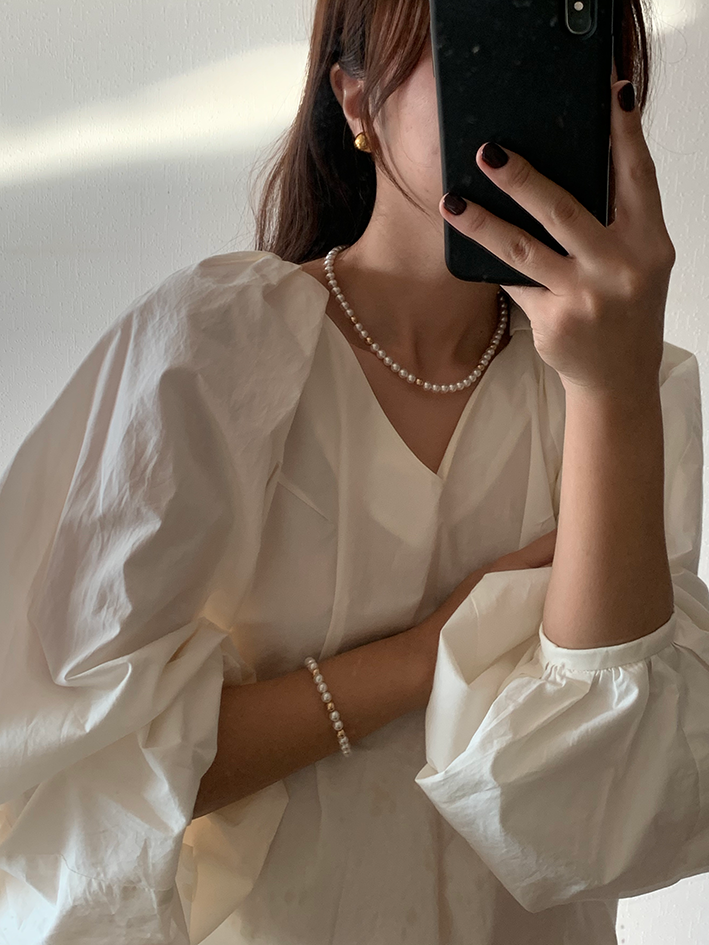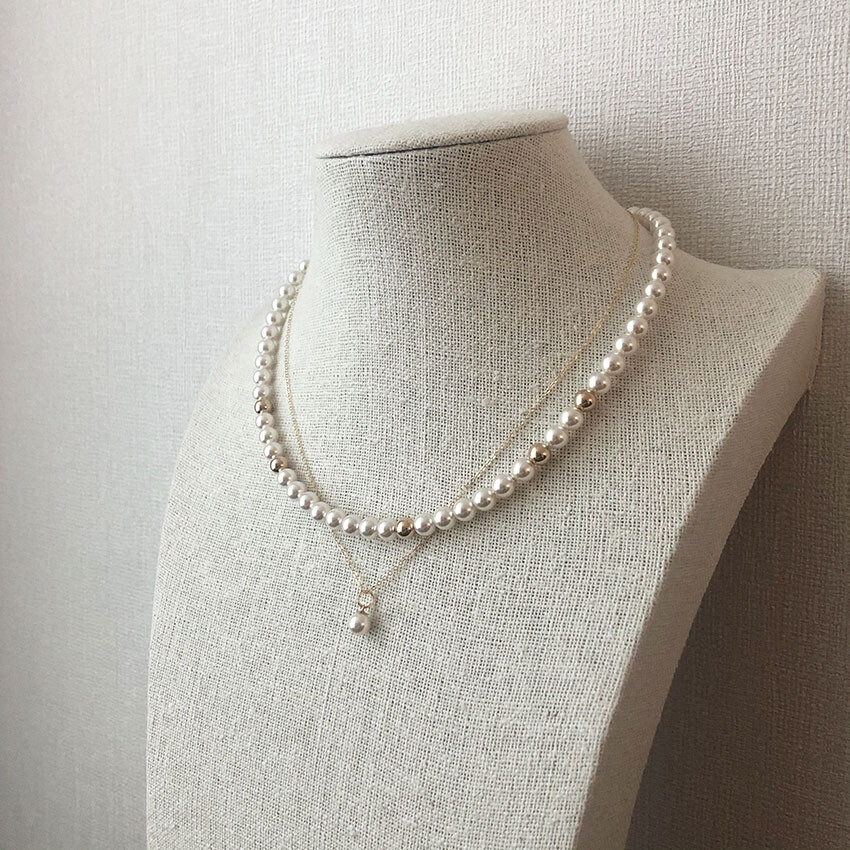 중간 중간 랜덤하게 배치된 골드볼이 다소 지루해 보일 수 있는 진주목걸이의 우아한 감성에 재미를 주는 역할을 합니다.