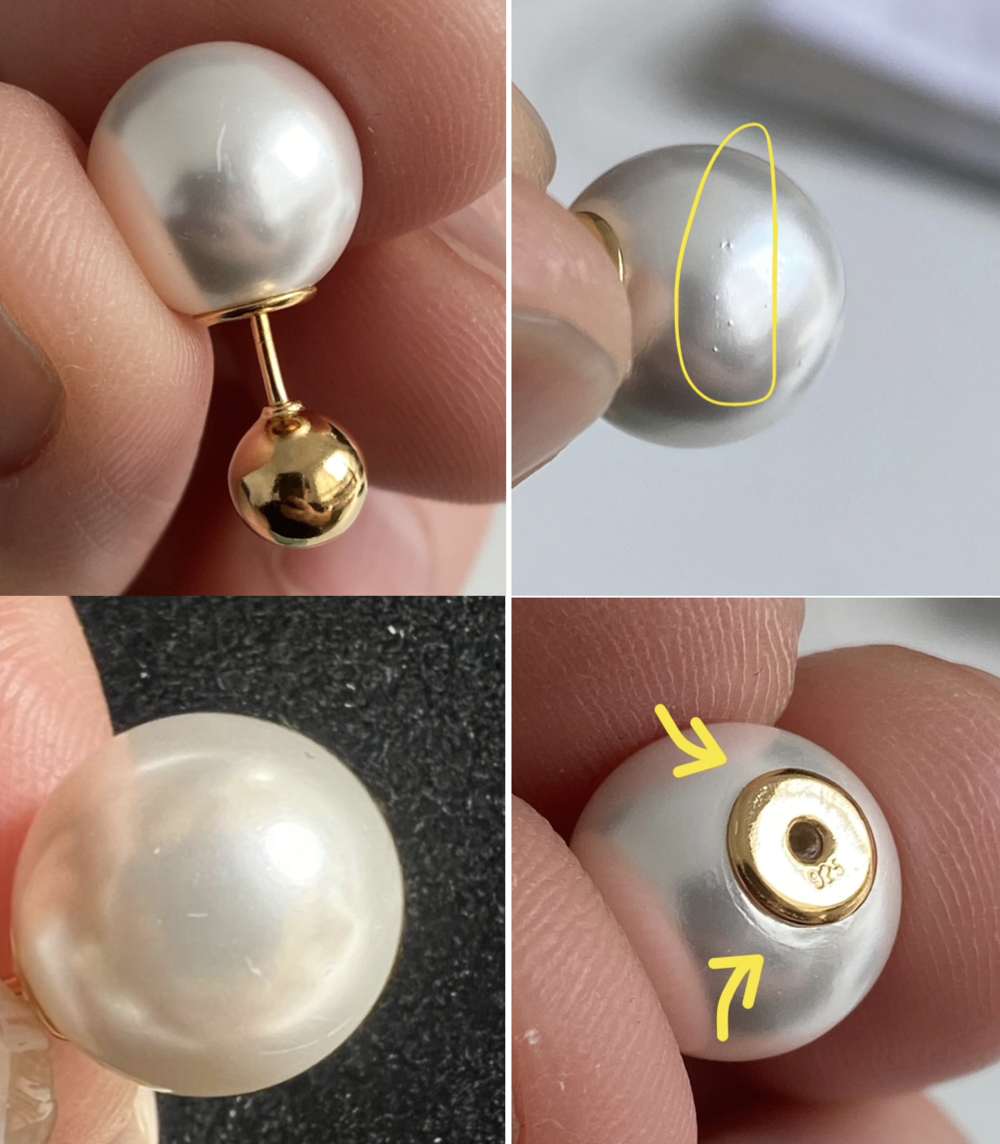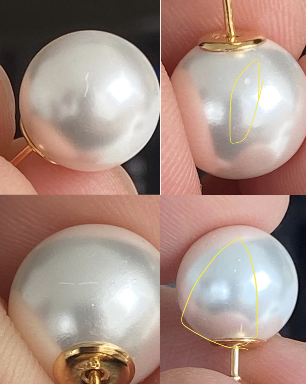 위에서도 말씀드렸다시피 이 제품의 진주는 구조상 어쩔 수 없이 인공진주를 써야하기 때문에 이 소재의 제작과정에서 발생될 수 있는 미세한 잔스크레치나 요철등이 발생될 수 있음을 알려드립니다.