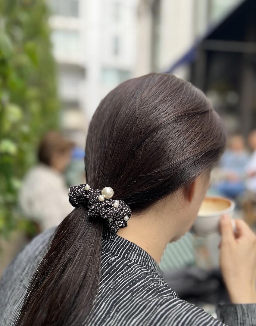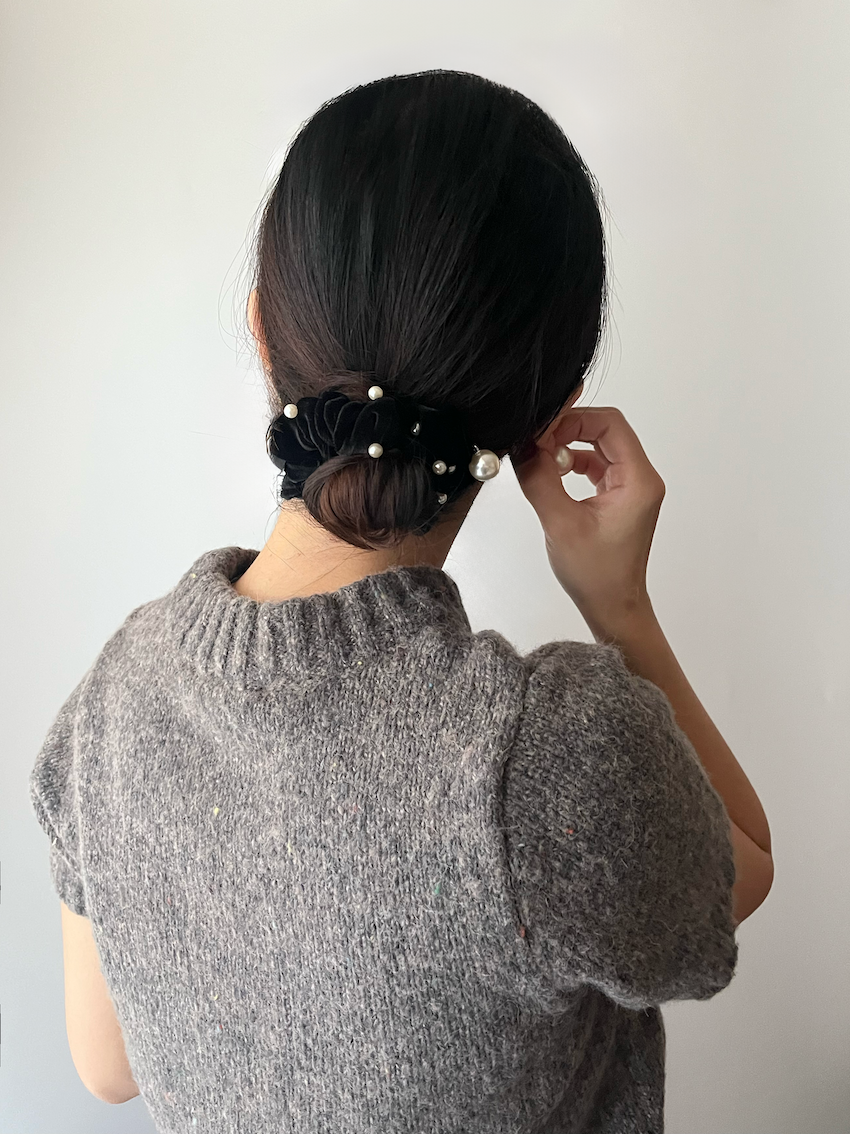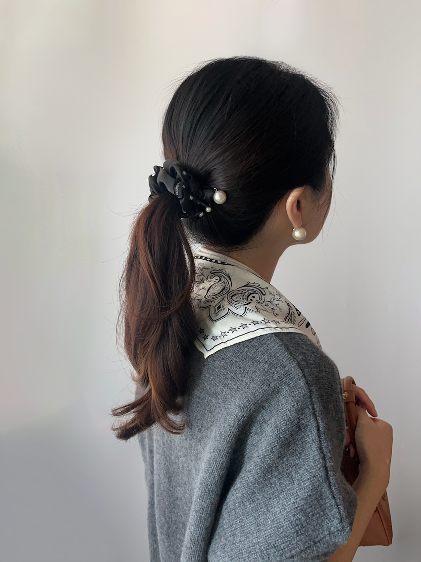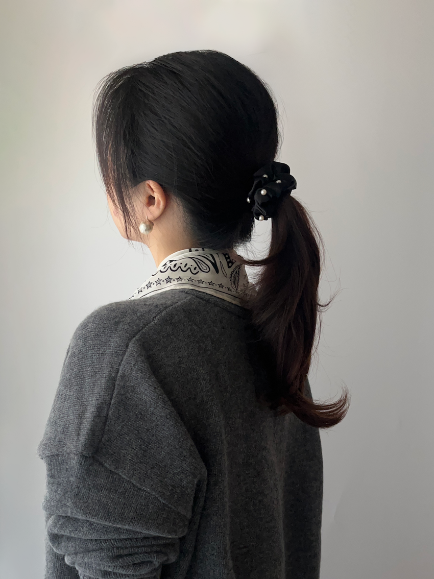 전체적으로 작은 진주가 촘촘하게 배열되어있고 볼륨 사이즈의 큰 진주 포인트까지 부착된 작지만 특별한 진주 스크런치입니다.