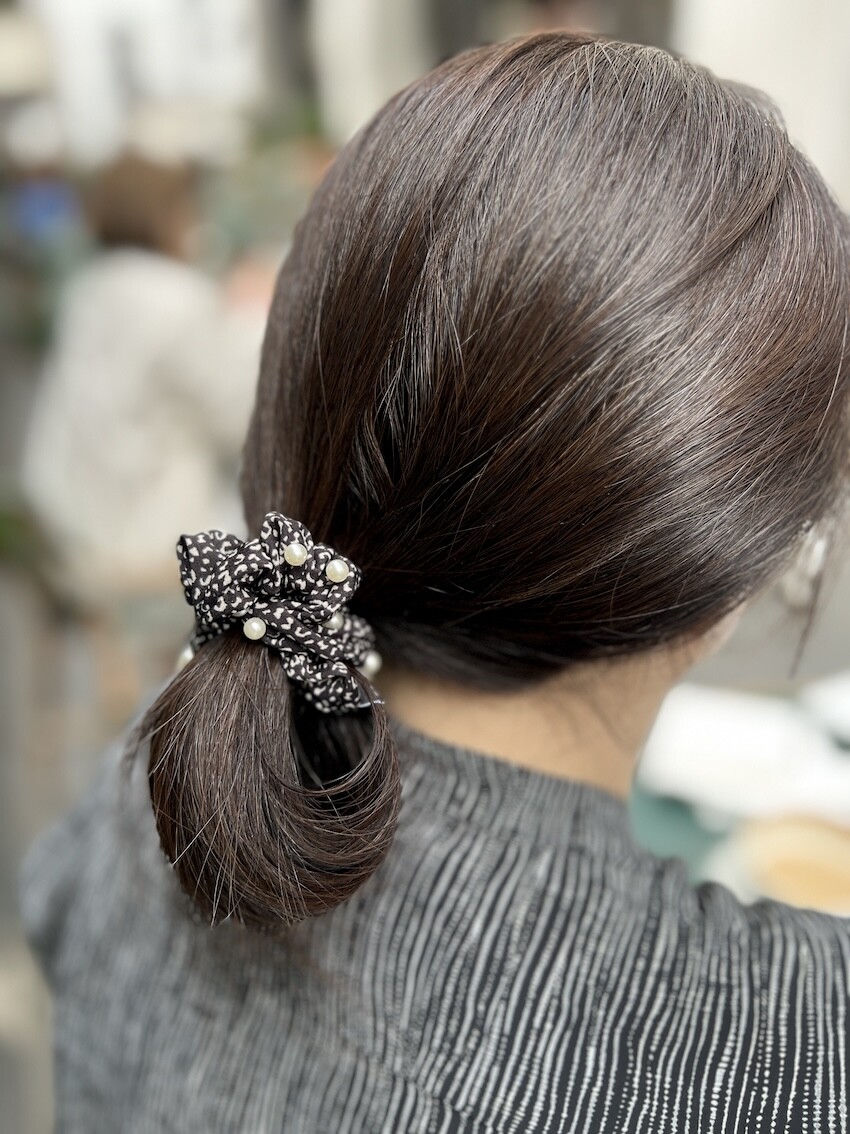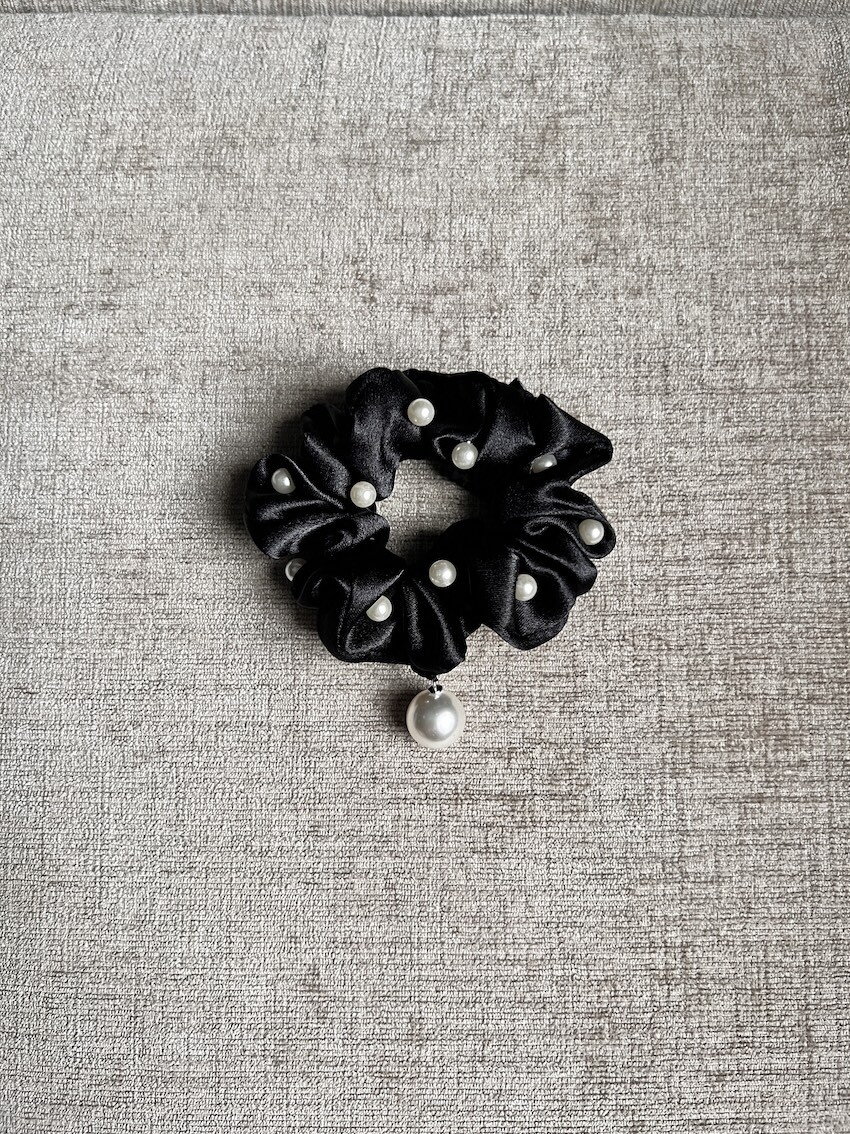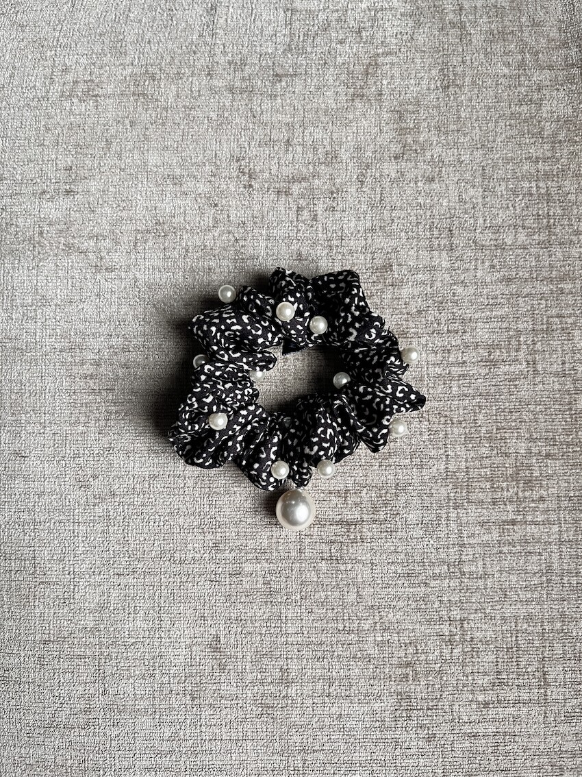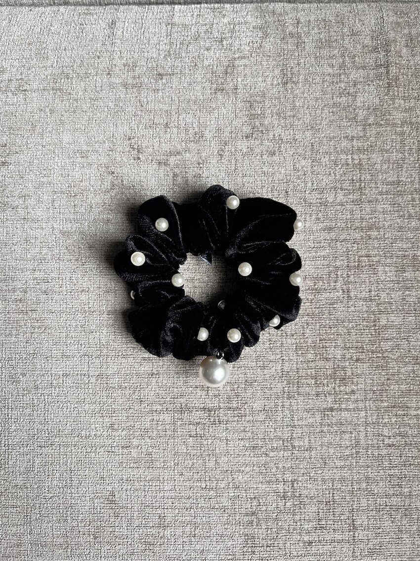 전체적으로 작은 진주가 촘촘하게 배열되어있고 볼륨 사이즈의 큰 진주 포인트까지 부착된 작지만 특별한 진주 스크런치입니다.