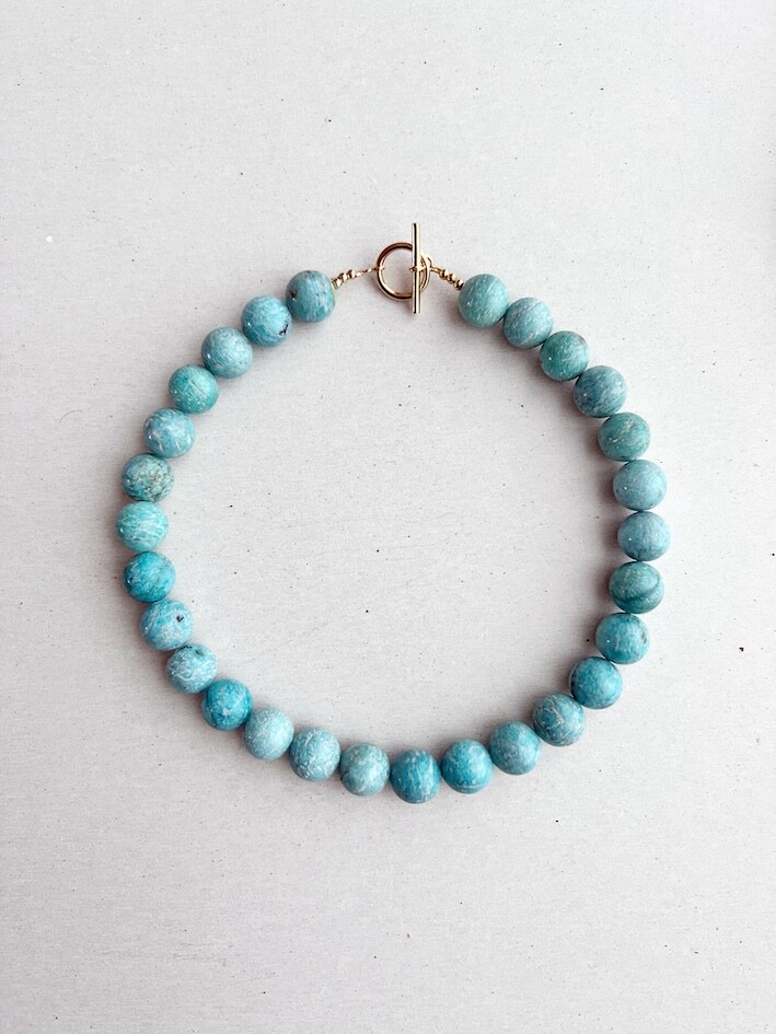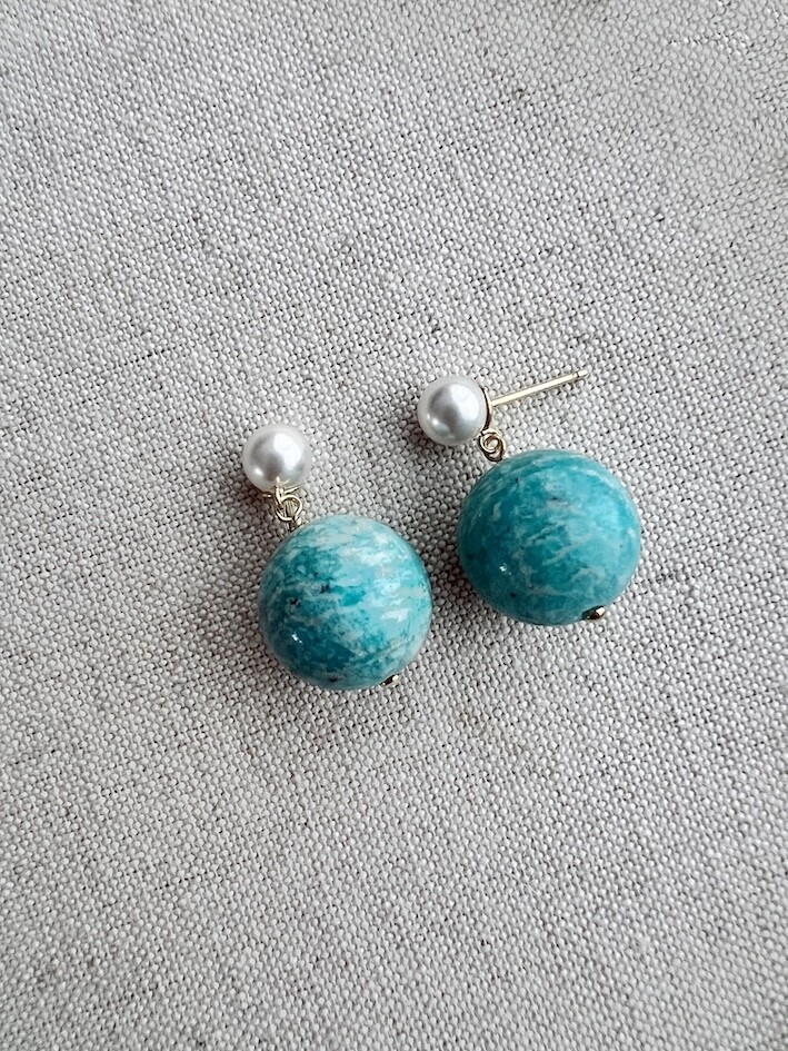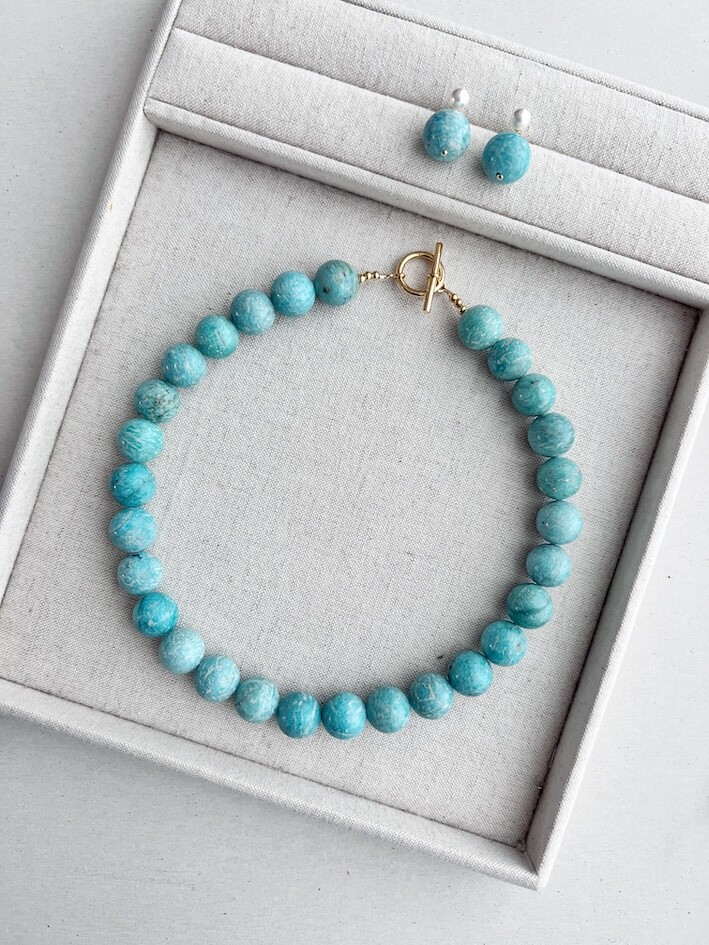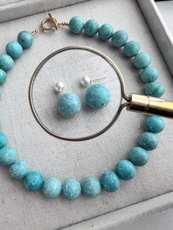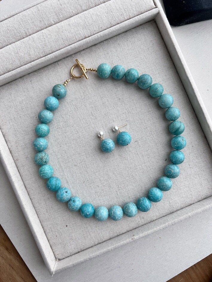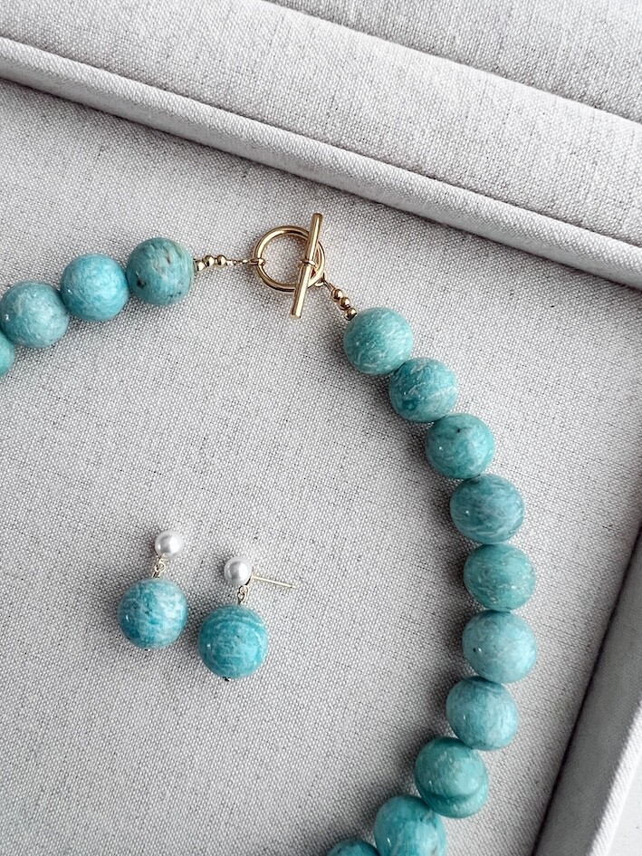 밝은 블루톤의 아마조나이트 원석으로 제작된 목걸이와 귀걸이입니다.