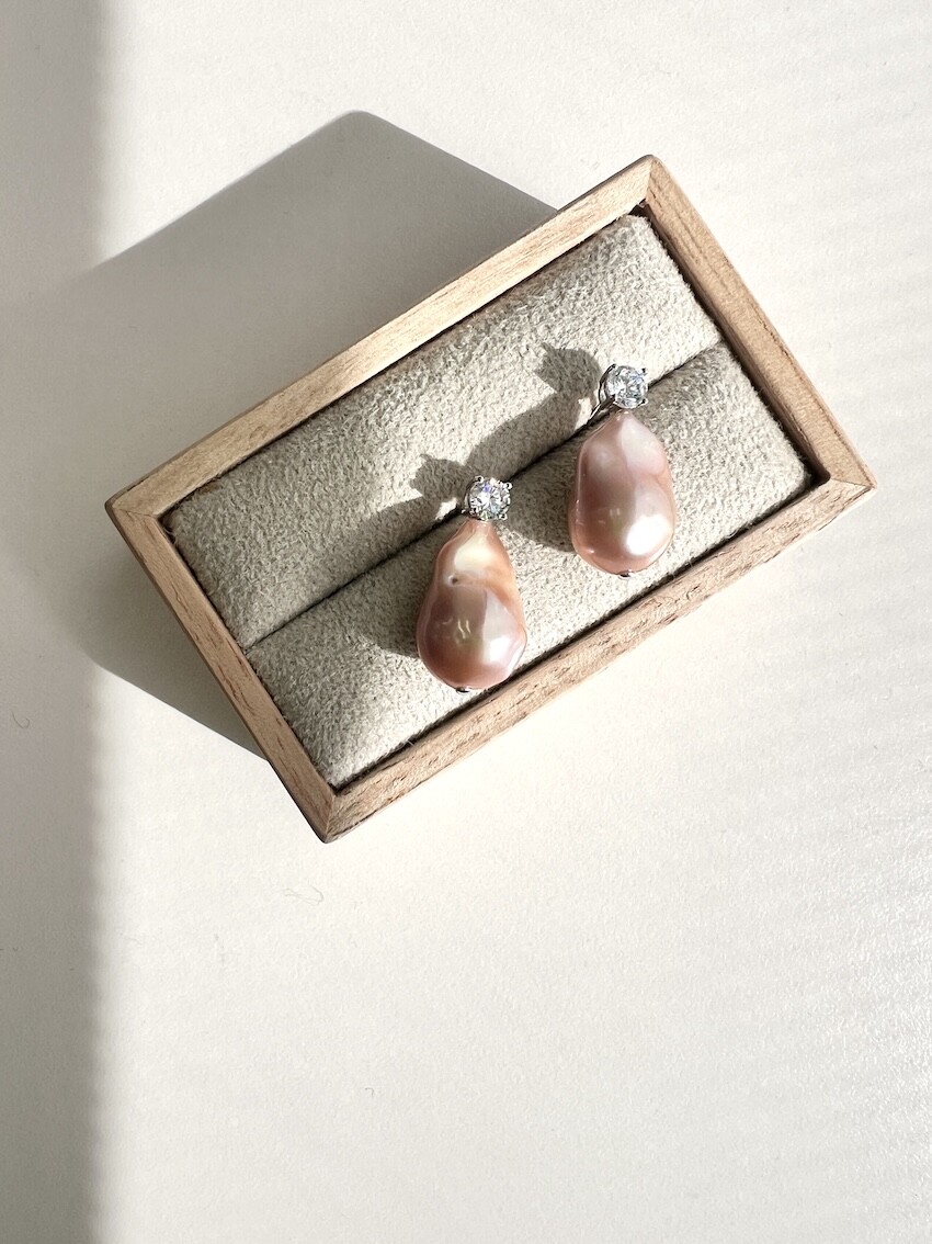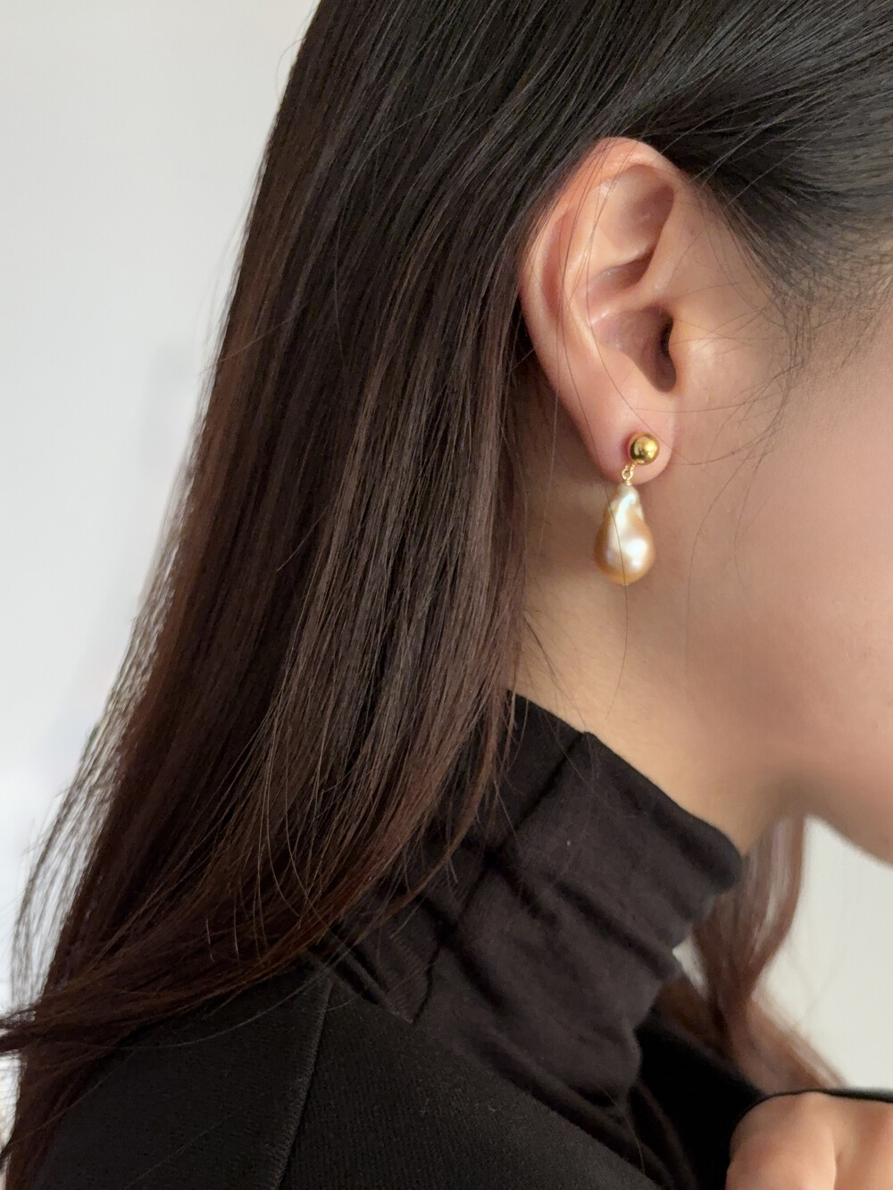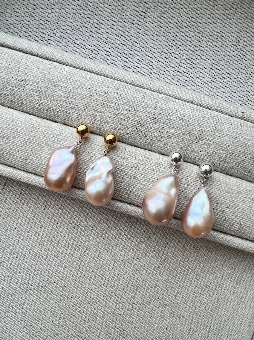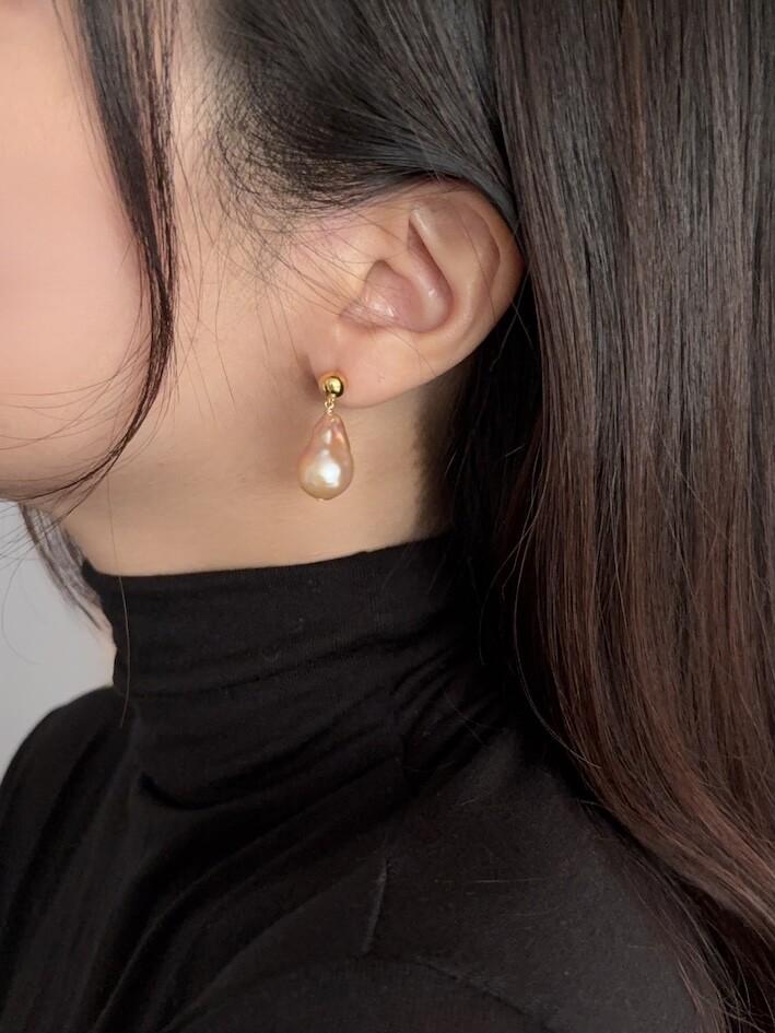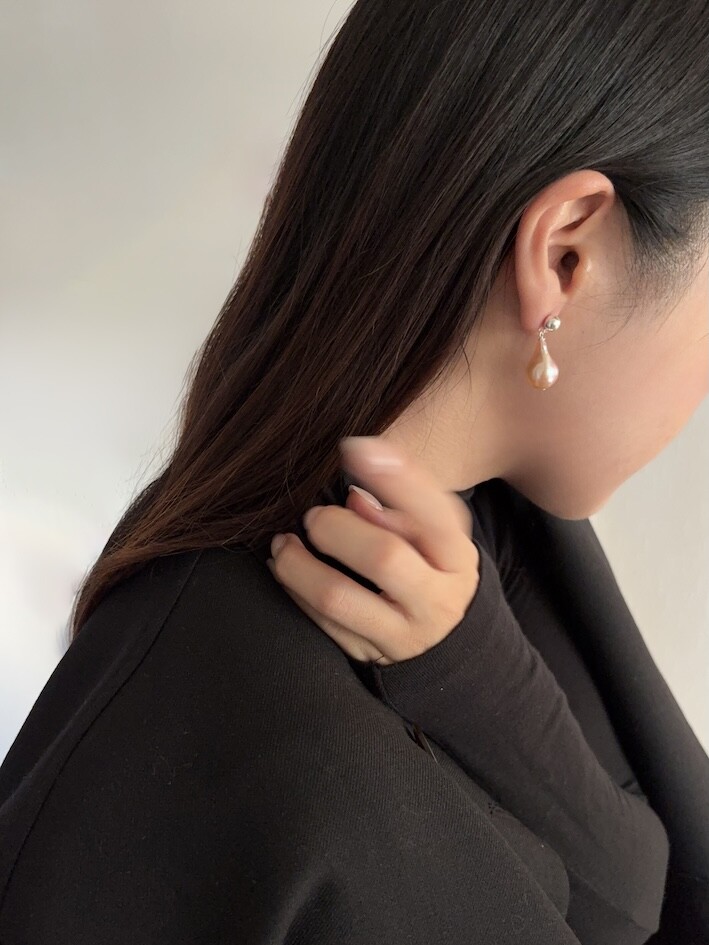 피치 핑크 컬러의 티어드랍 형태 바로크 진주로 만든 귀걸이입니다.