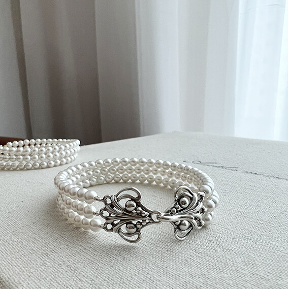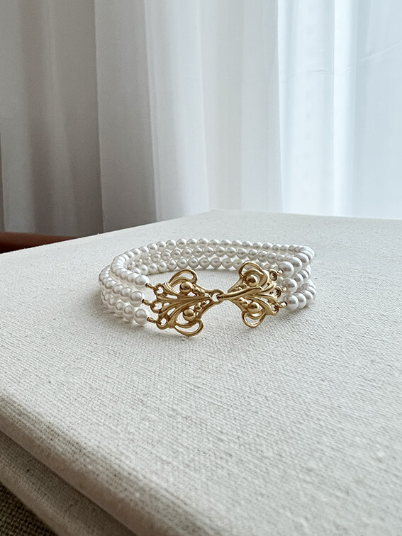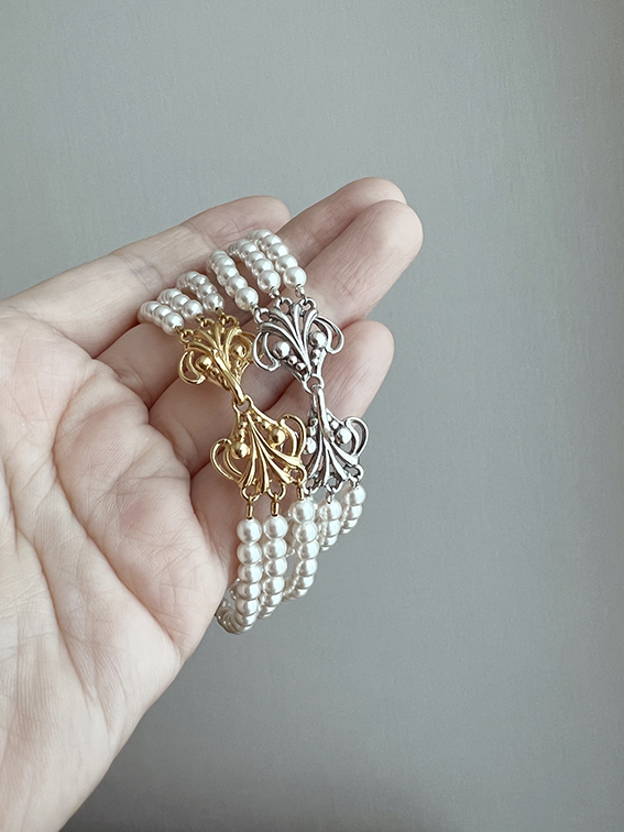 골드 버메일과 앤틱 실버(유화)로 정성들여 만들어진 이국적인 클래습에 진주 스트랜드가 3줄로 레이어드 된 클래식한 팔찌입니다.