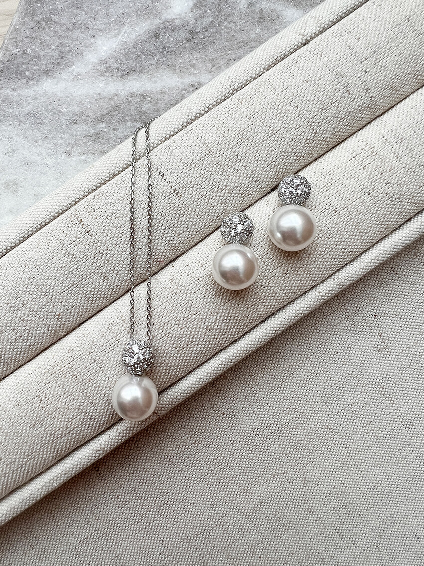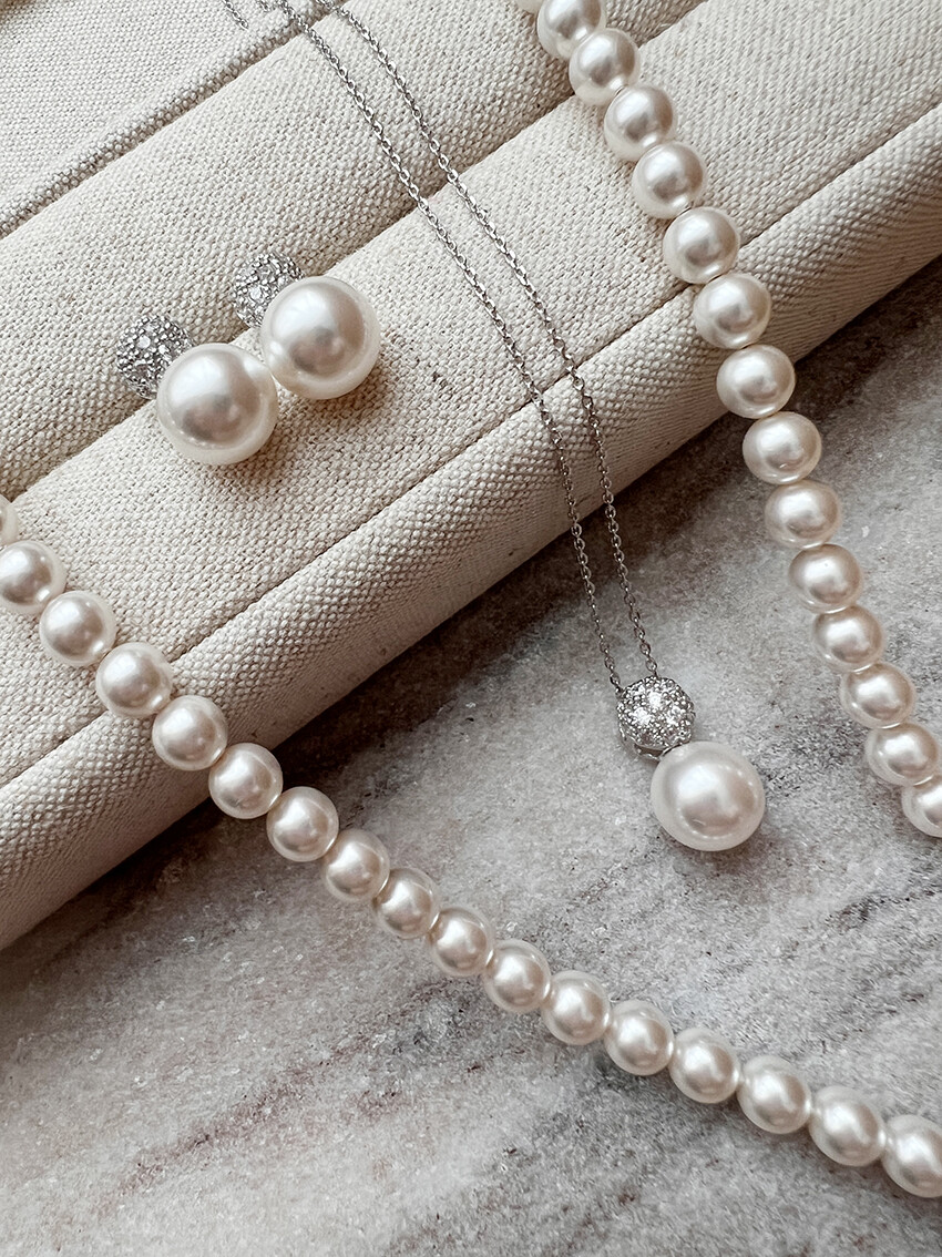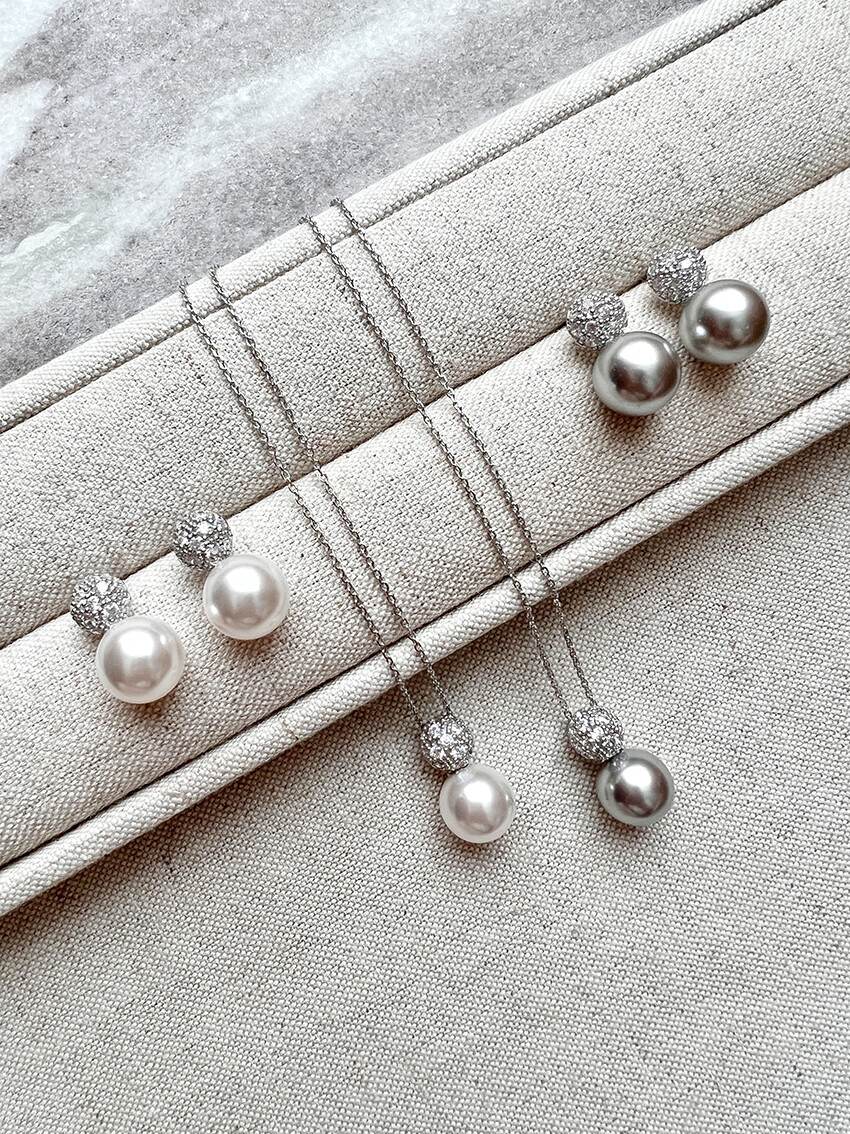 진주는 크리스탈 큐빅과의 조화를 고려하여 광택감이 많은 스와로브스키 진주를 사용했습니다.