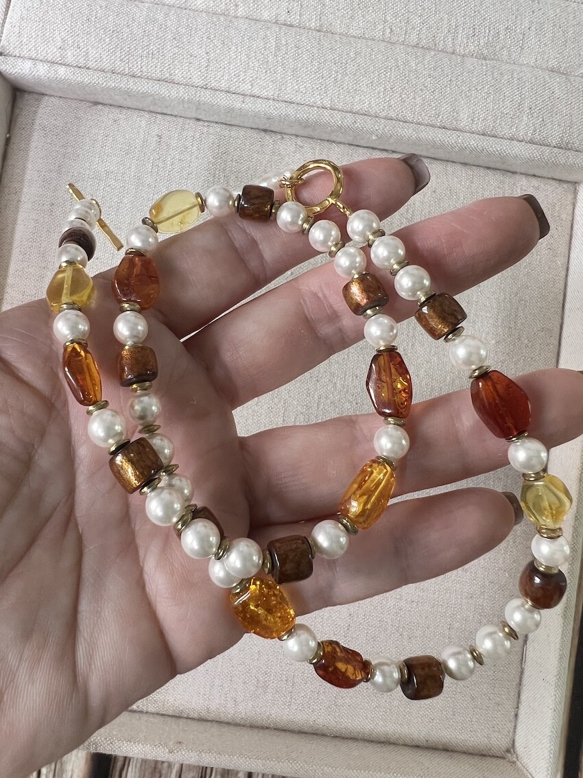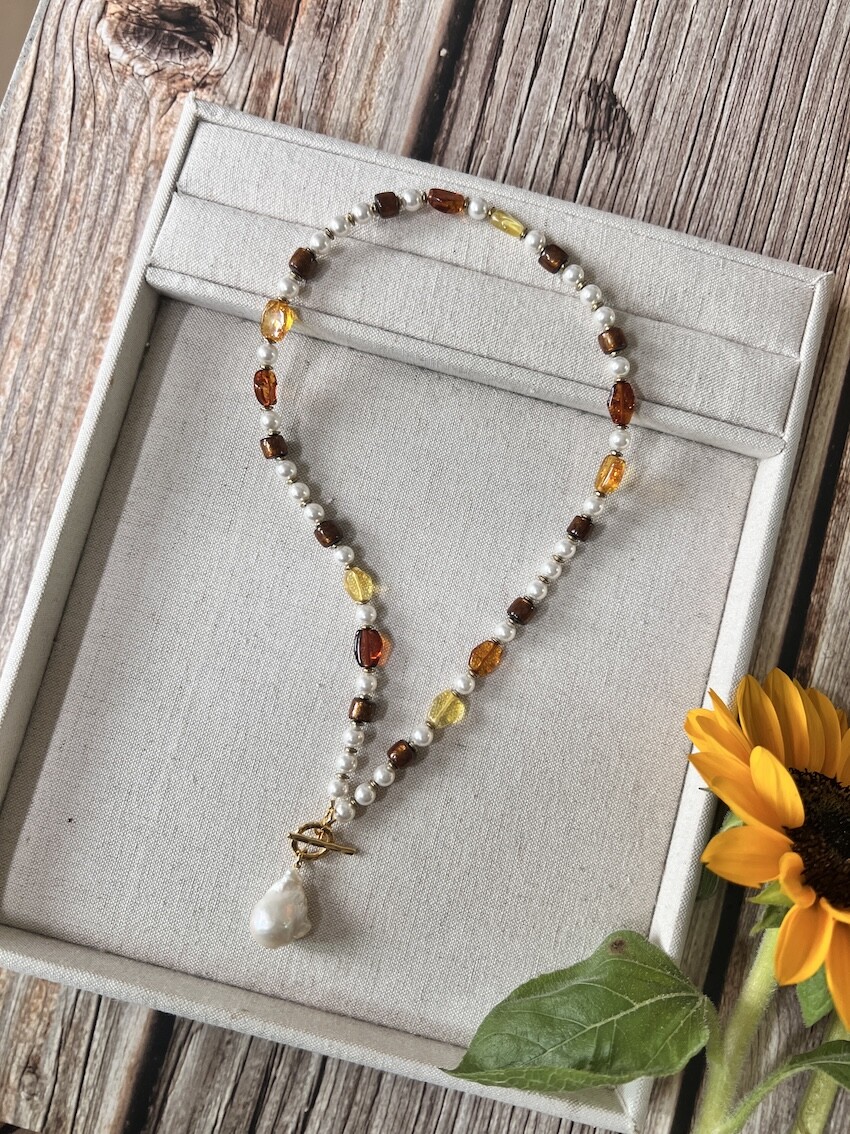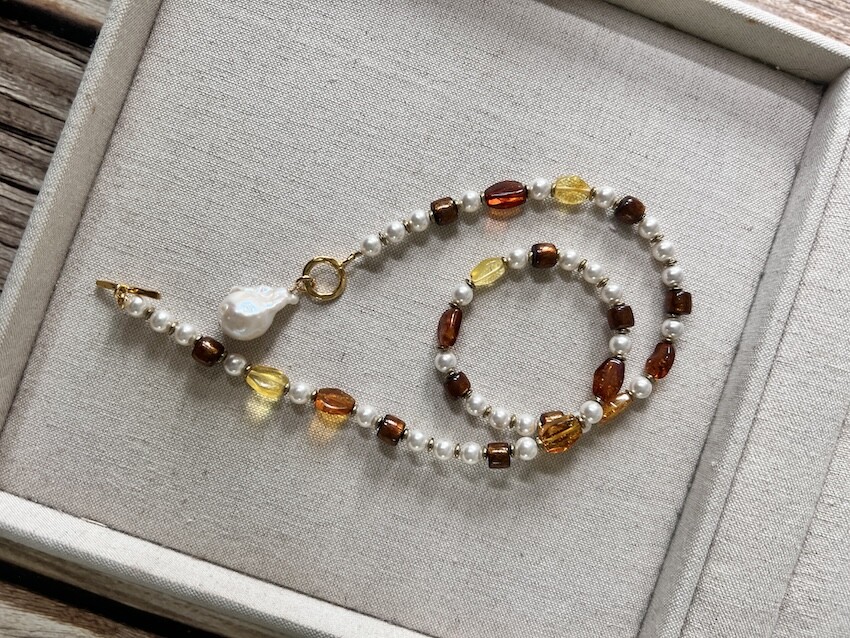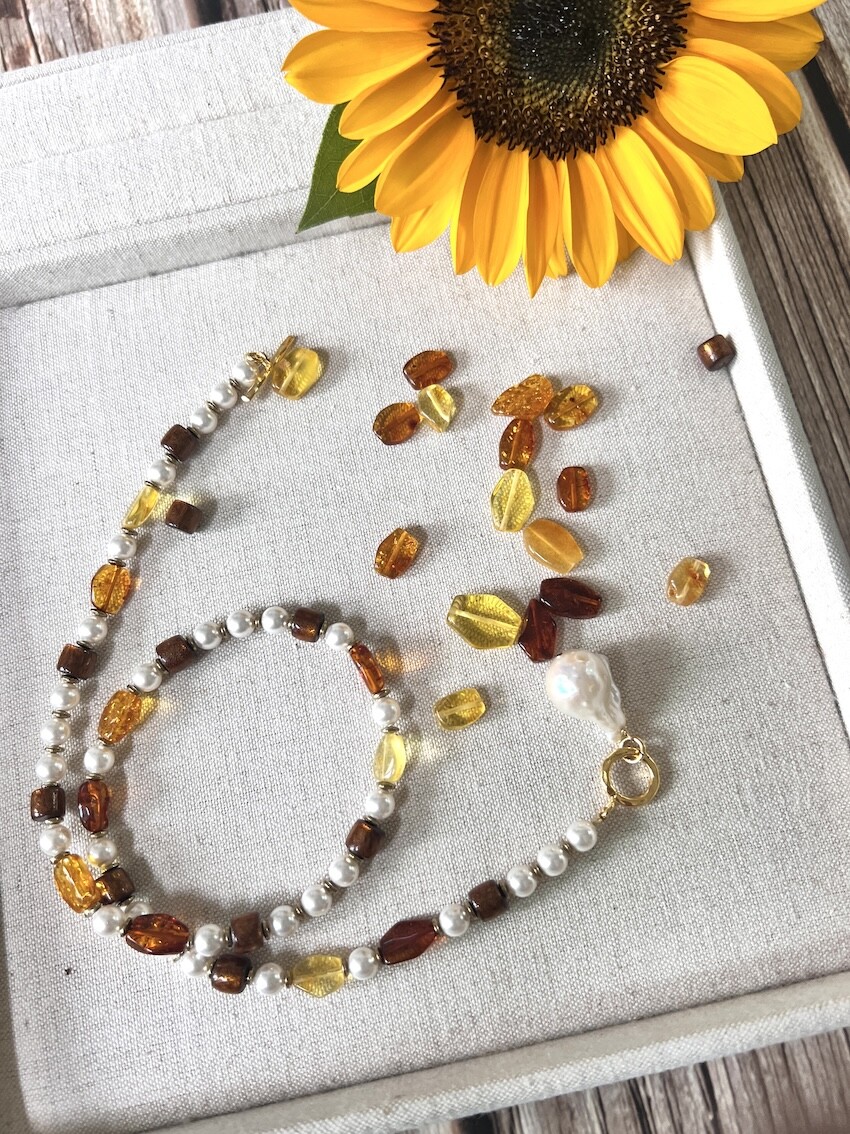 영롱한 호박 원석과 골드 브라운빛의 글라스 비즈 및 헤머타이트가 조화를 이룹니다.