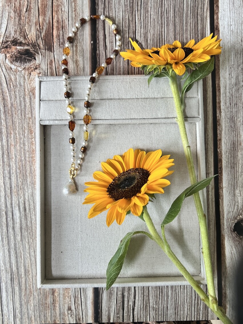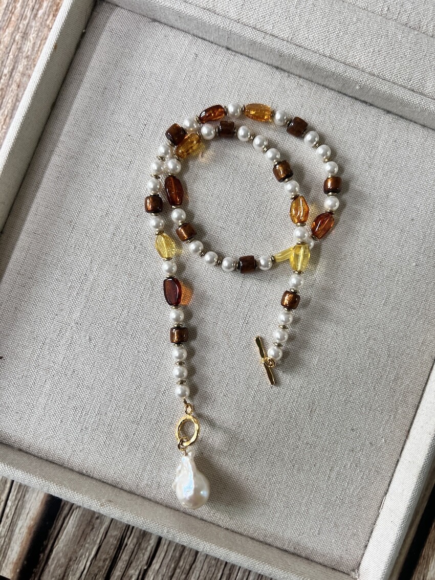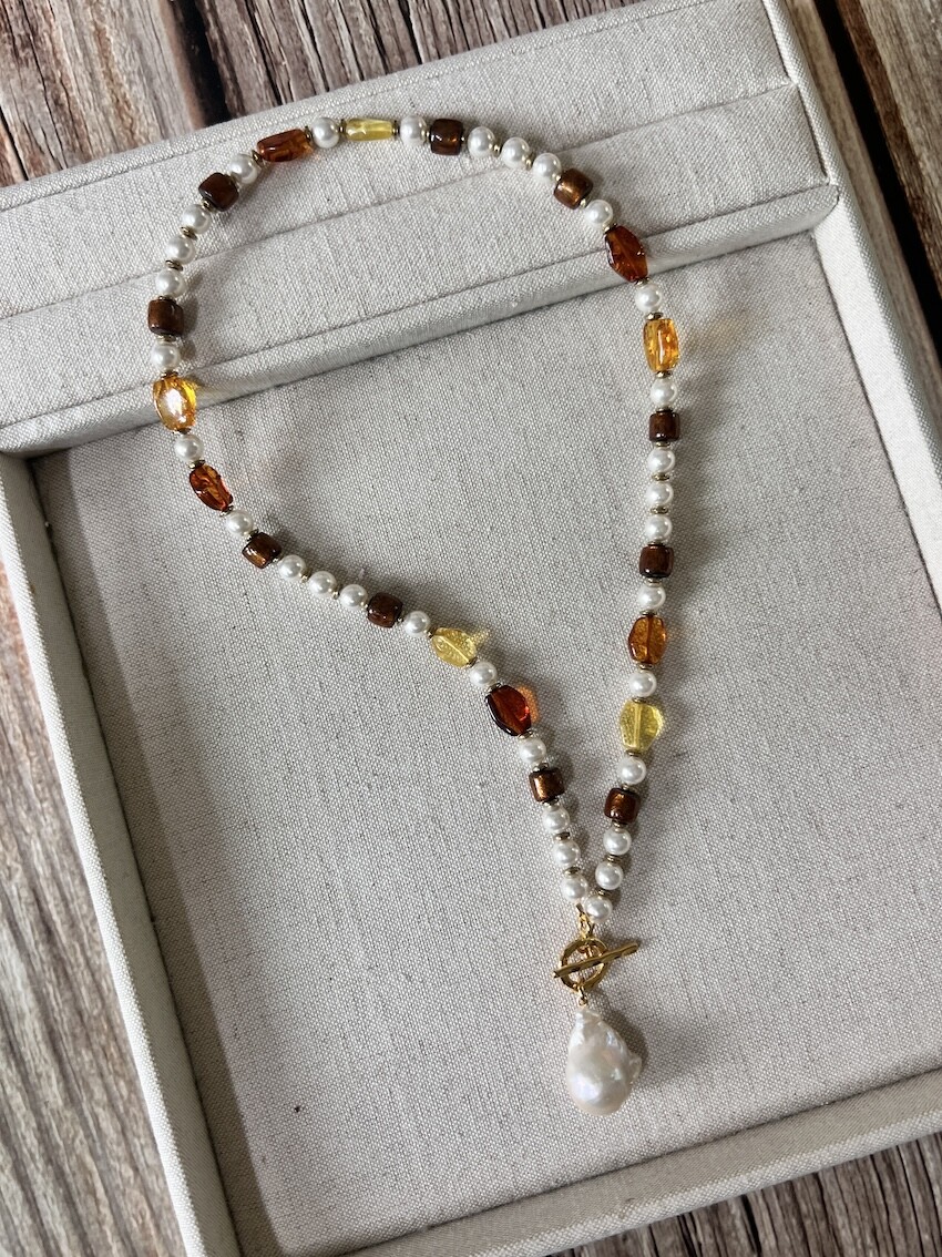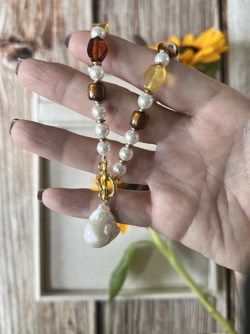 영롱한 호박 원석과 골드 브라운빛의 글라스 비즈 및 헤머타이트가 조화를 이룹니다.