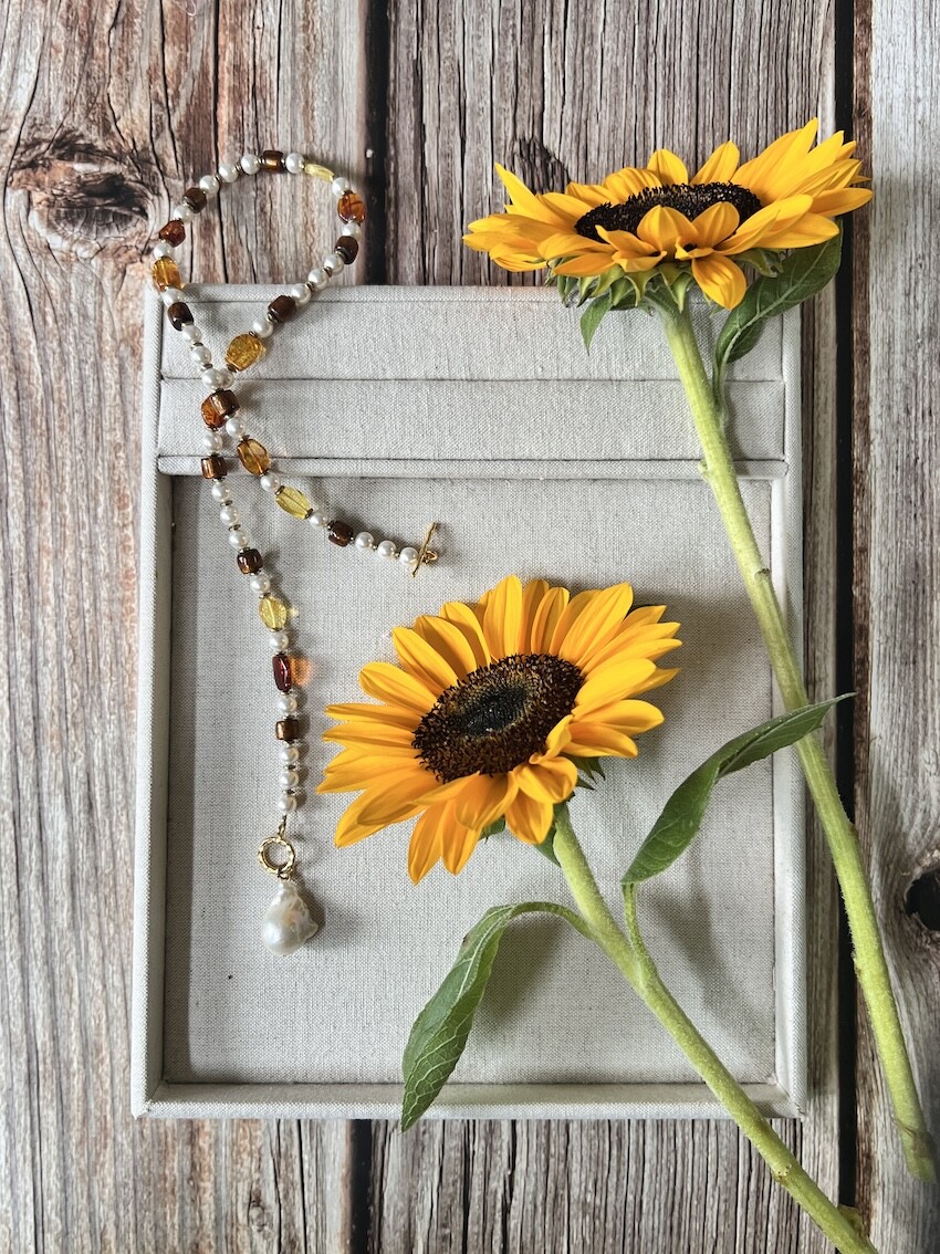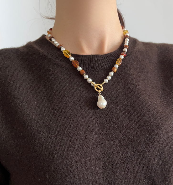 메탈릭한 피니쉬의 글라스 비즈와 각기 다른 톤의 호박 원석, 그리고 우아하게 반짝이는 스와로브스키 진주가 그 주인공들입니다.