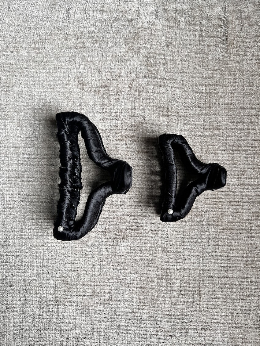 원단을 사선으로 신축성이 있는 방향으로 재단하고 바이어스 테이프처럼 만든 후 이를 리본처럼 만들어 집게핀 바디 전체를 감싸는 방식으로 수작업으로 제작되었습니다.