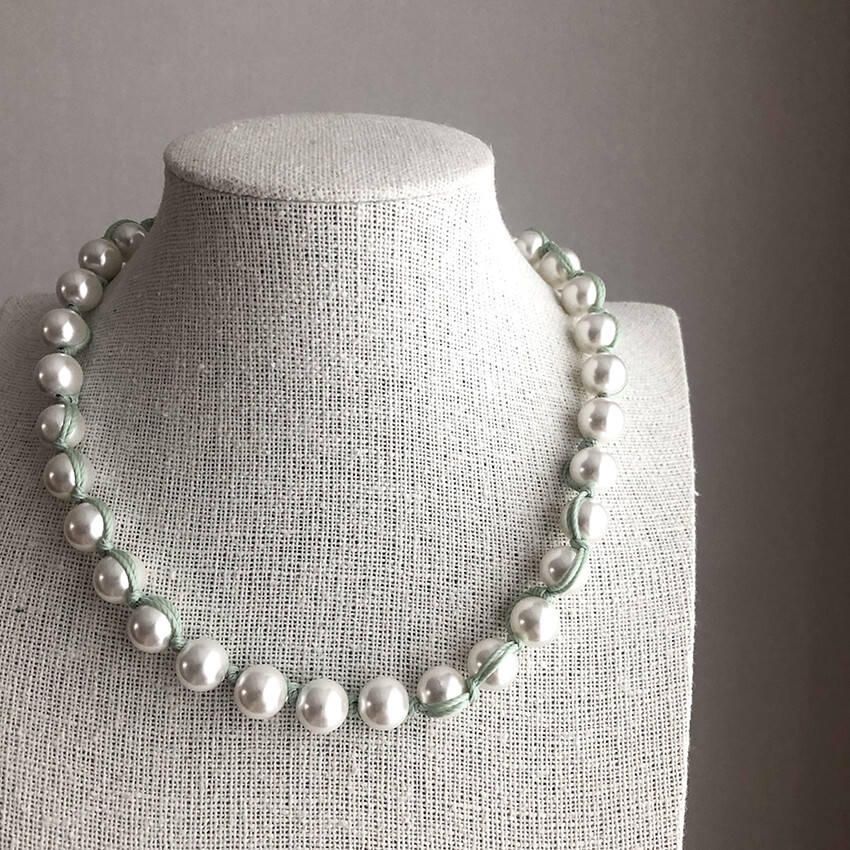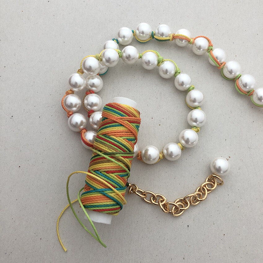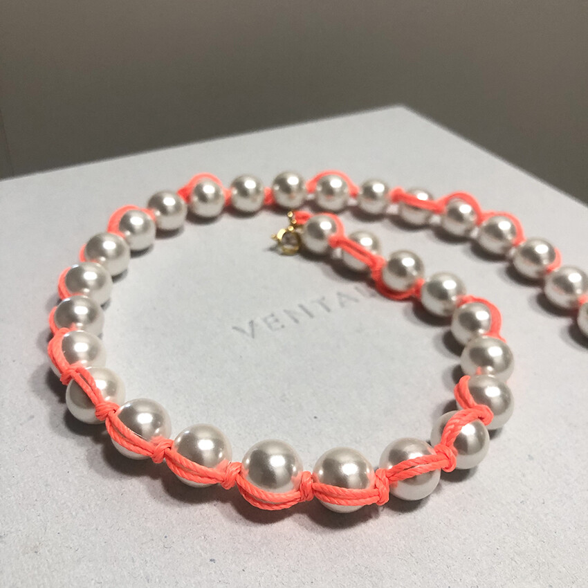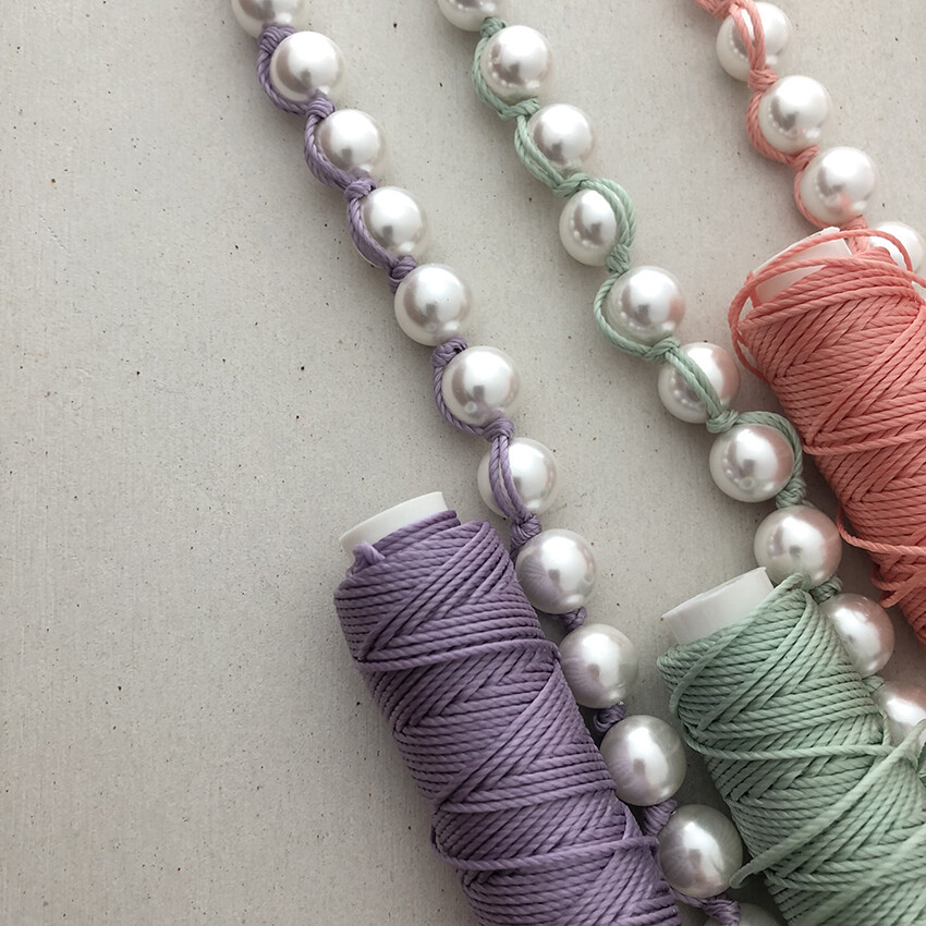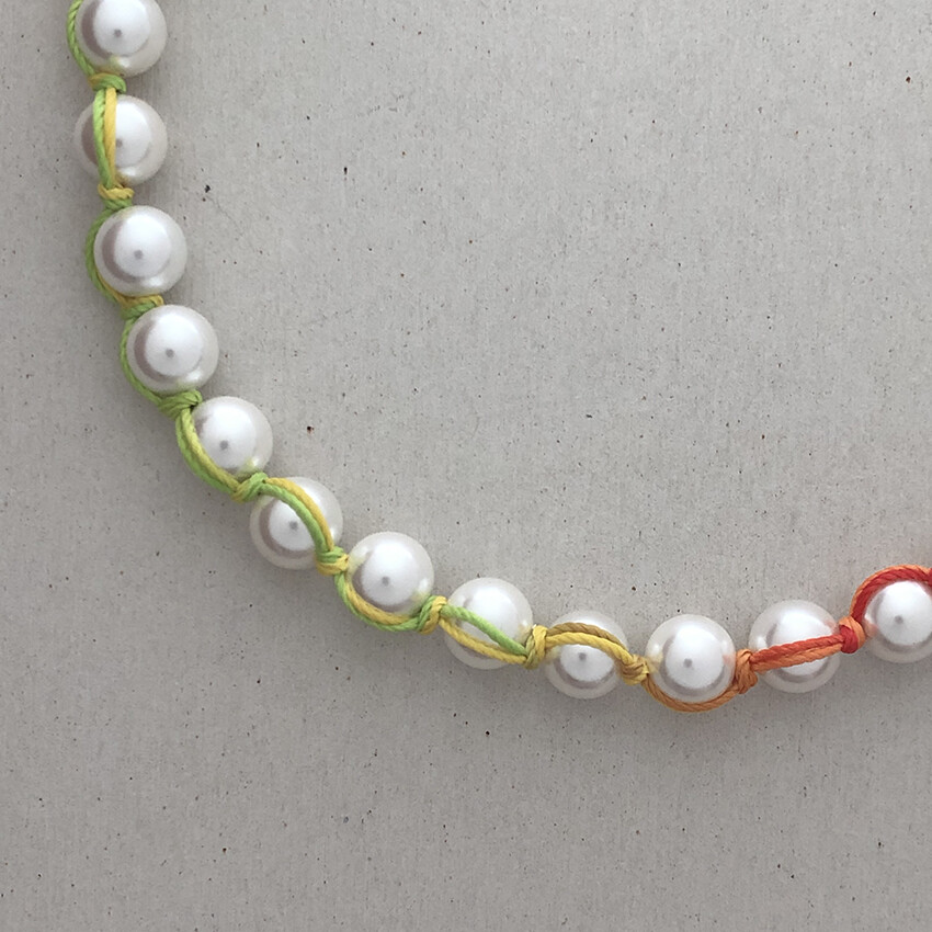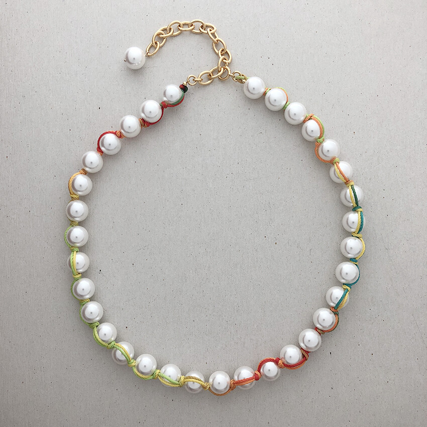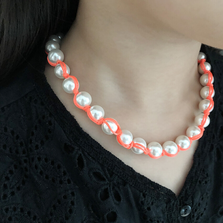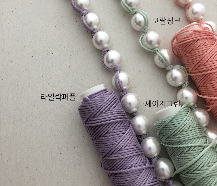 진주알 사이 사이로 2-3mm 정도로 두껍게 매듭져진 컬러 실로 인해 진주의 볼륨감이 더욱 도드라져 보이며 캐주얼한 아웃핏에 포인트가 되어 줄 나만의 특별한 목걸이가 됩니다.