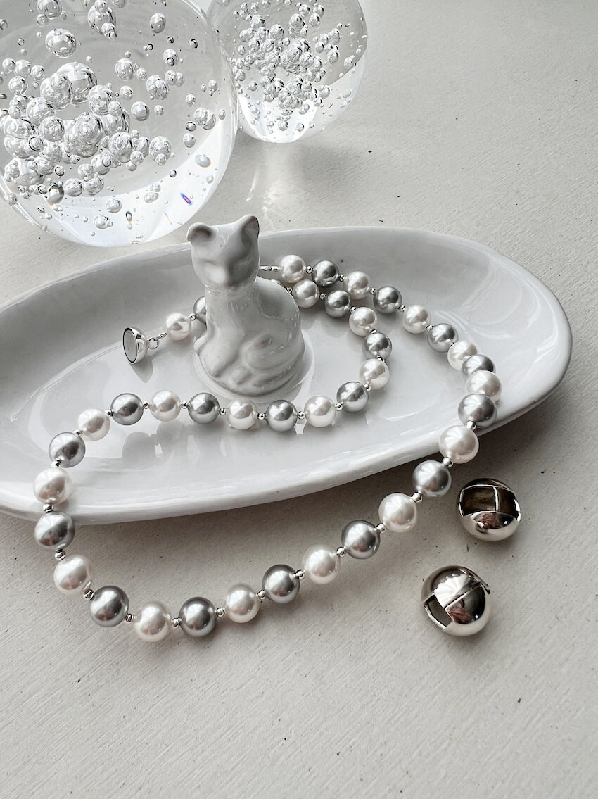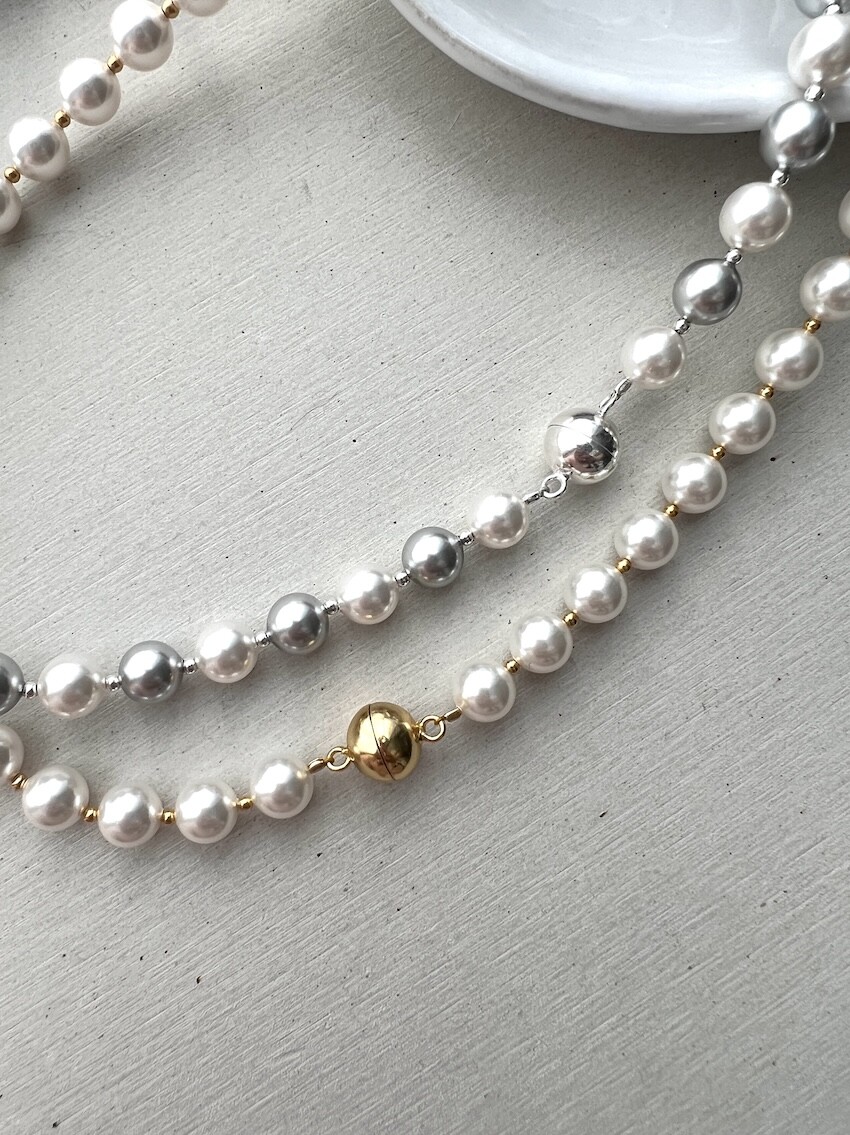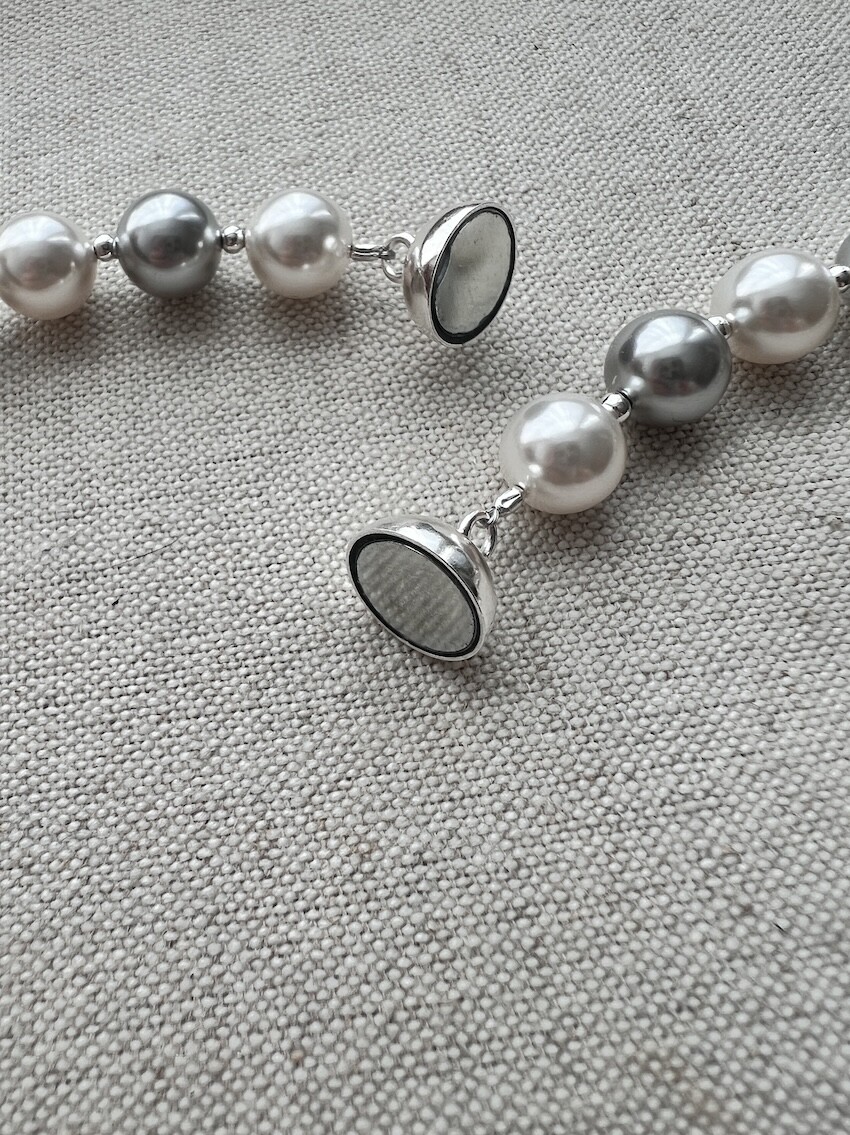 실버 소재의 캐주얼한 자석 형태의 클래습과 스와로브스키 진주로 제작한 특별한 진주비드목걸이입니다.