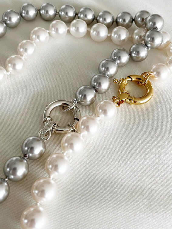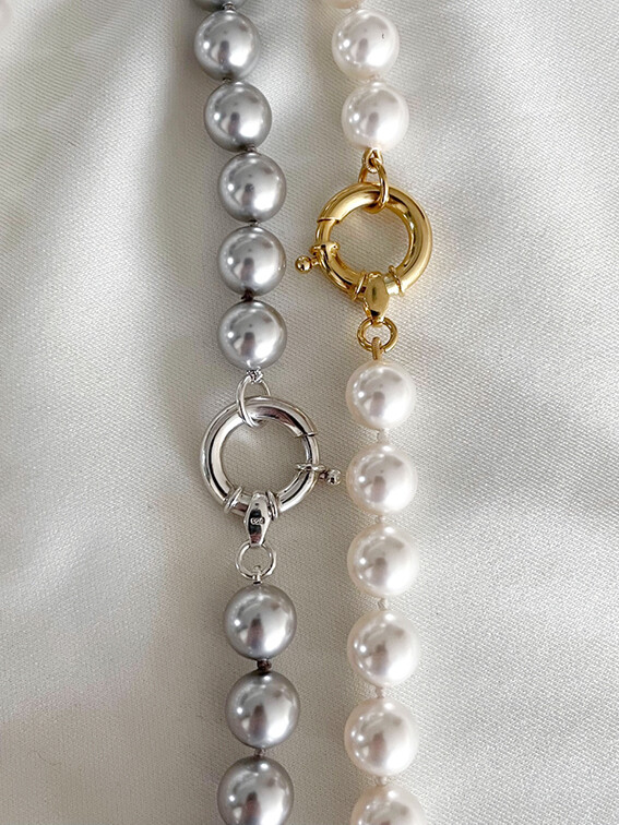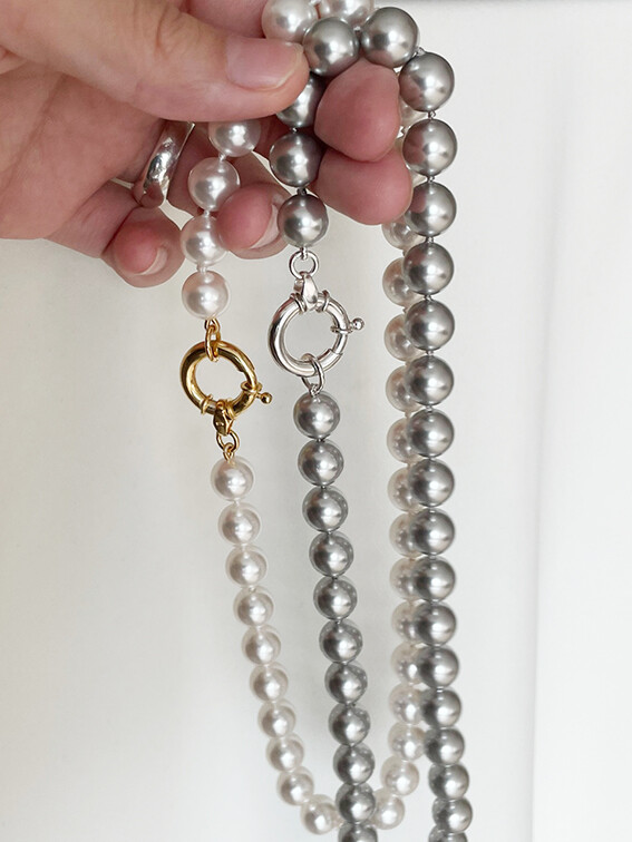 전통적인 스타일의 진주목걸이에서 벗어나 캐주얼과 다양한 스타일에 믹스매치 될 수 있도록 현대적인 느낌의 스와로브스키 진주를 사용해 대형사이즈의 오픈형 스프링 클래습과 연결된 디자인을 진행하였습니다.