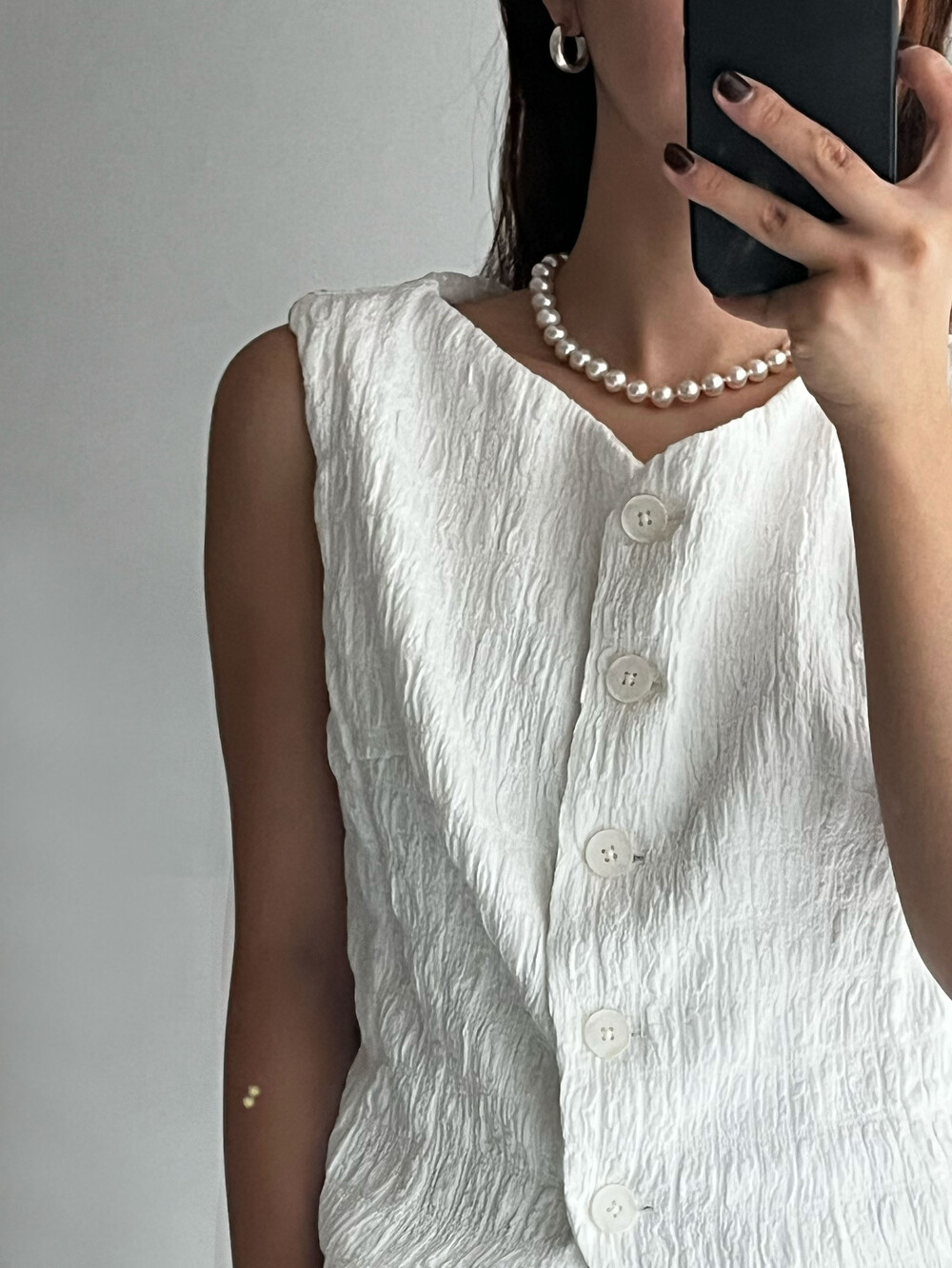 실제 진주 사이 사이에 있는 실크실 매듭 간격과 진주컬러의 대비로 더욱 입체적인 느낌을 자아냅니다.