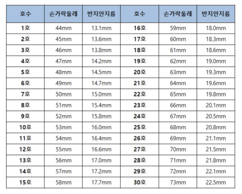 이의 사이즈가 위의 표에 명시된 손가락 둘레사이즈가 될것이고 이에 맞는 호수를 지정하시면 됩니다.
