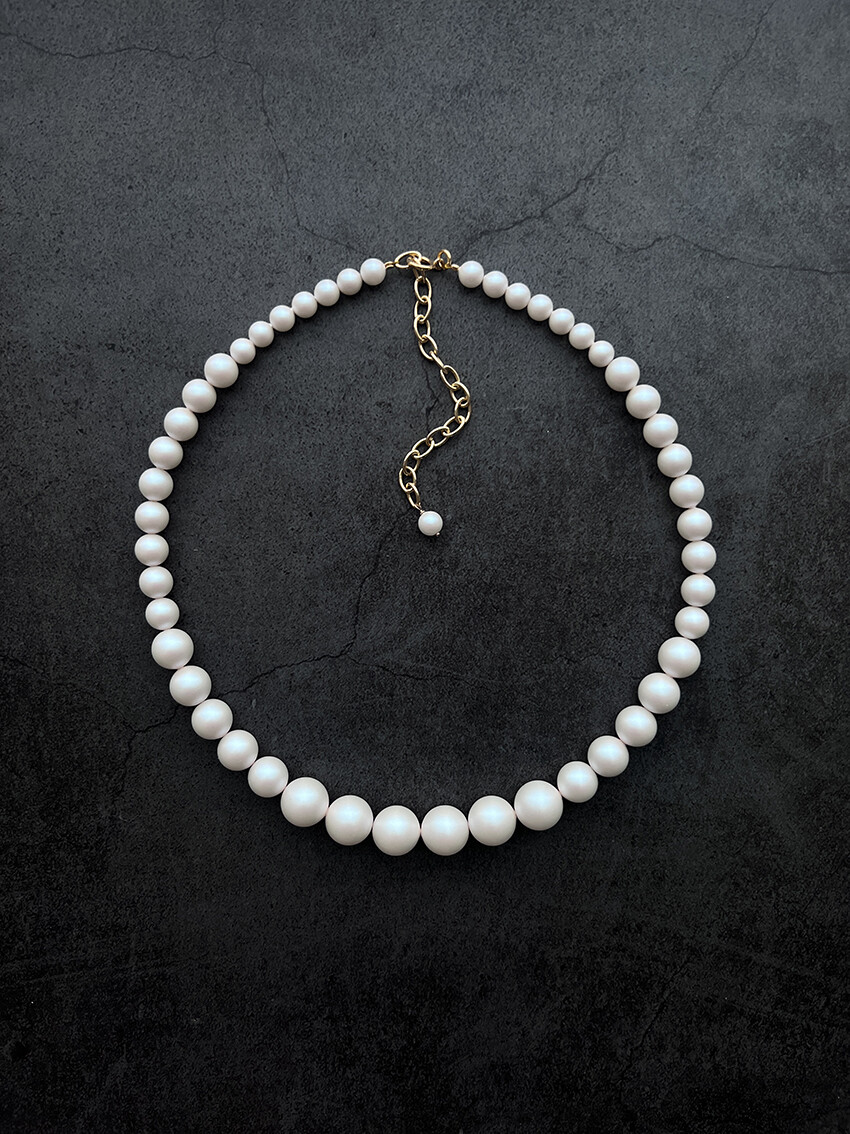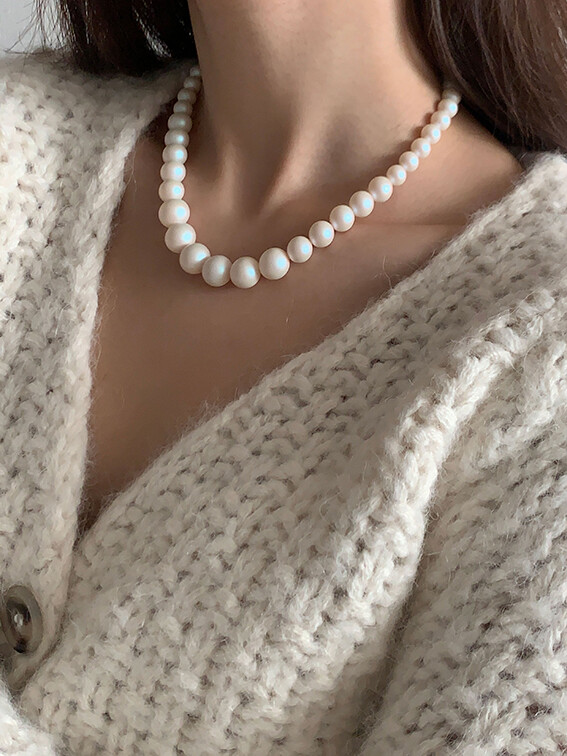 중앙 12mm 크기의 진주부터 뒷쪽 6mm 까지 사이즈가 점진적으로 줄어드는 목걸이입니다.