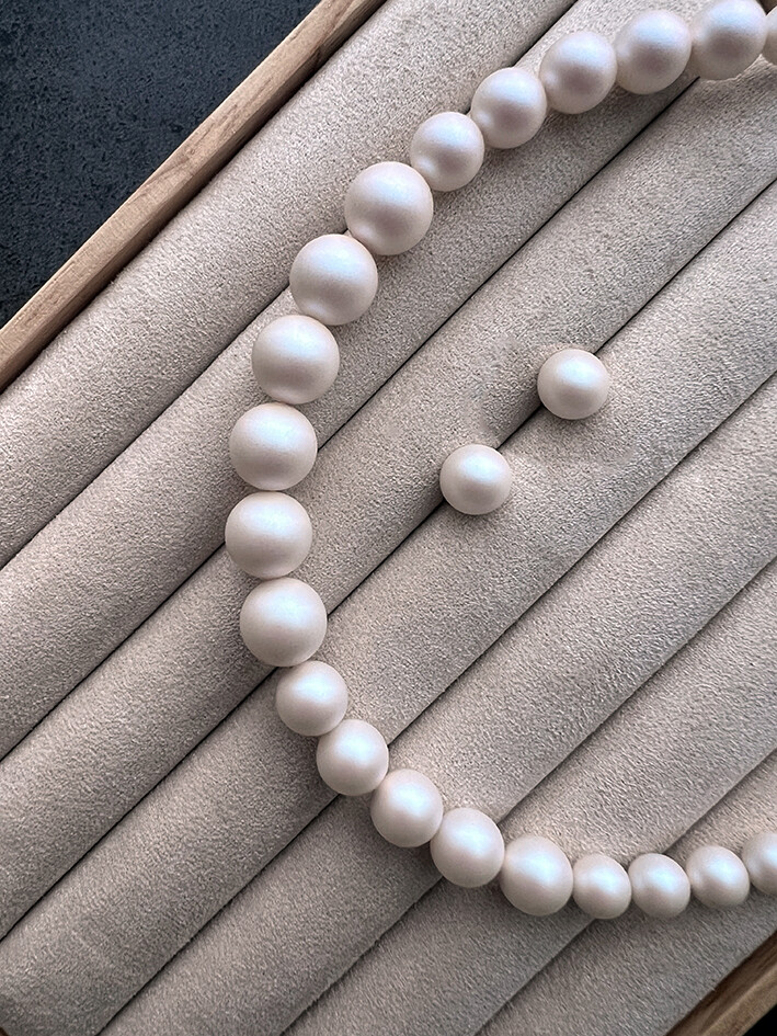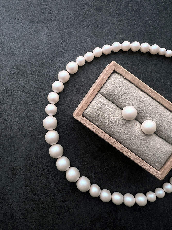 위의 이미지에서 보시는바와 같이 매트한 피니쉬와 함께 은은하게 퍼져 나오는 특유의 광택감이 기존의 일반적인 진주들과는