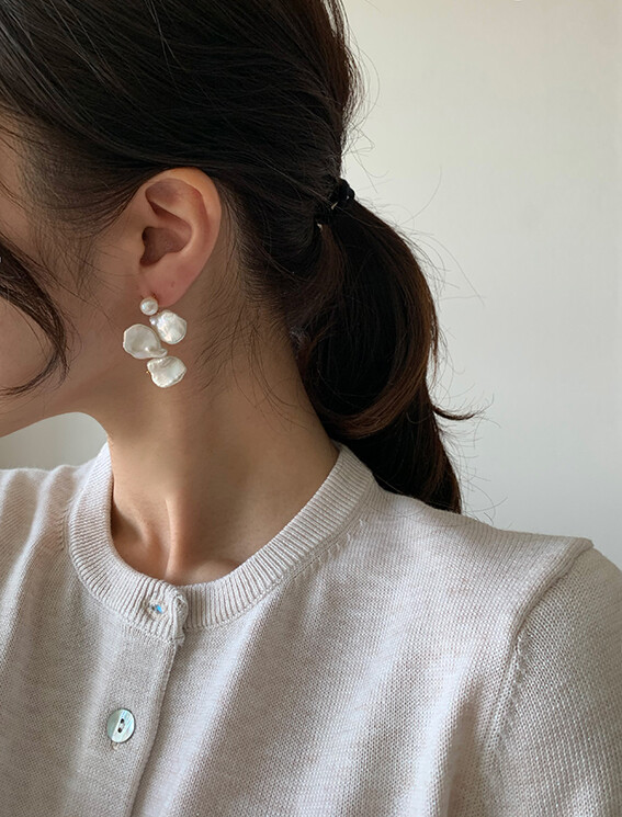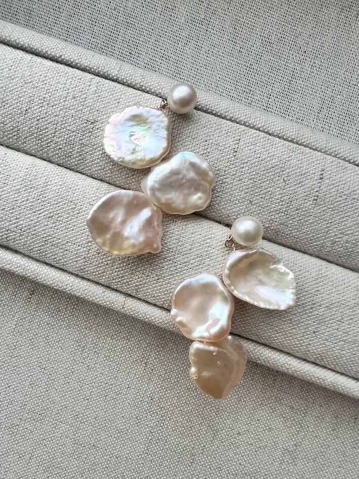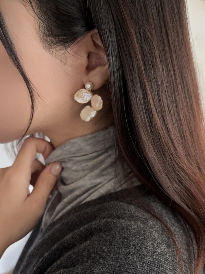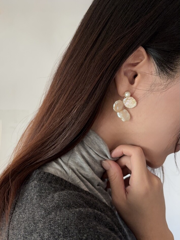 담수진주 포스트가 달린 귀걸이 본체에 3 피스의 아름다운 케이시 진주를 엮어 핸드메이드로 제작했습니다.