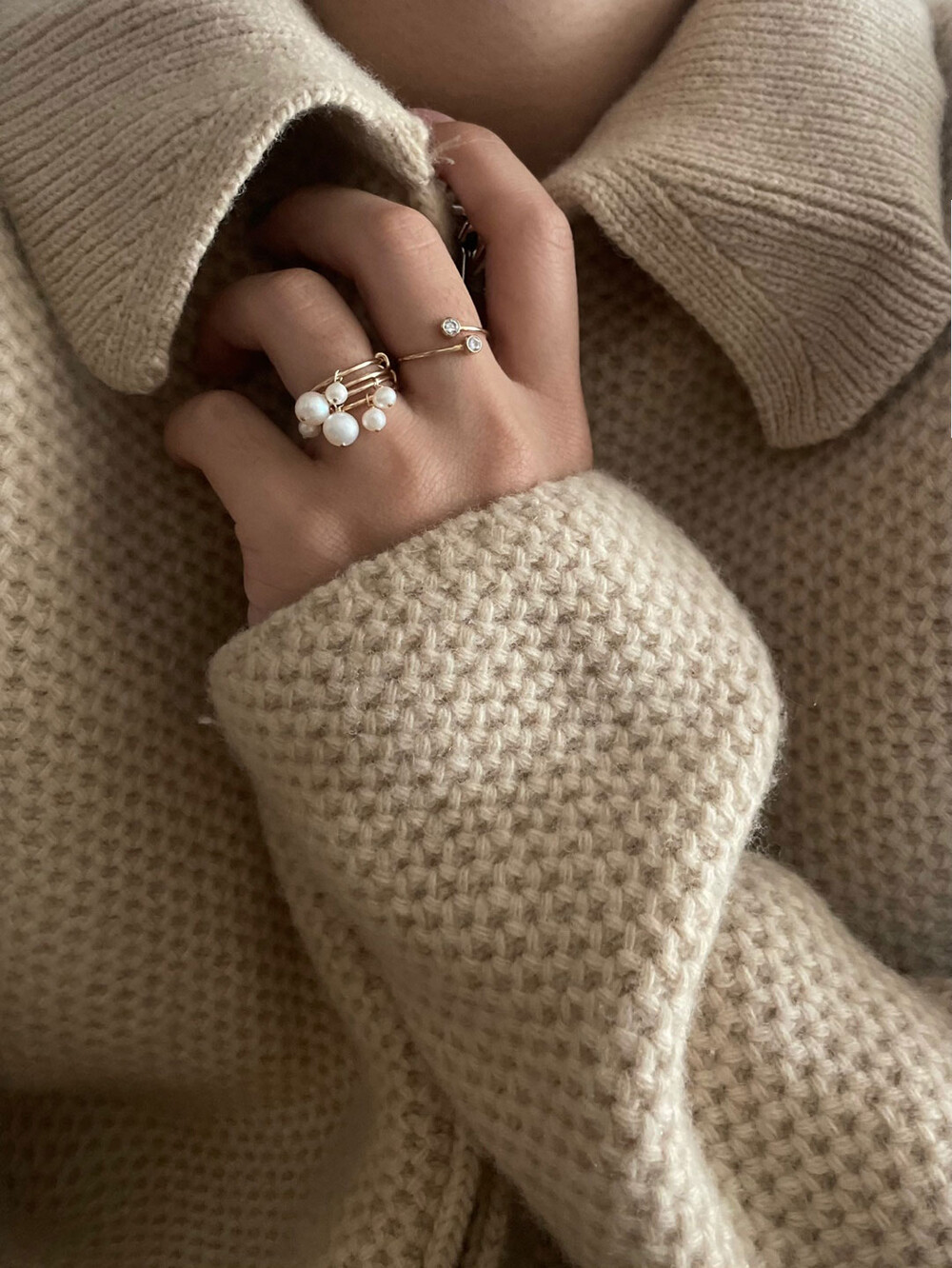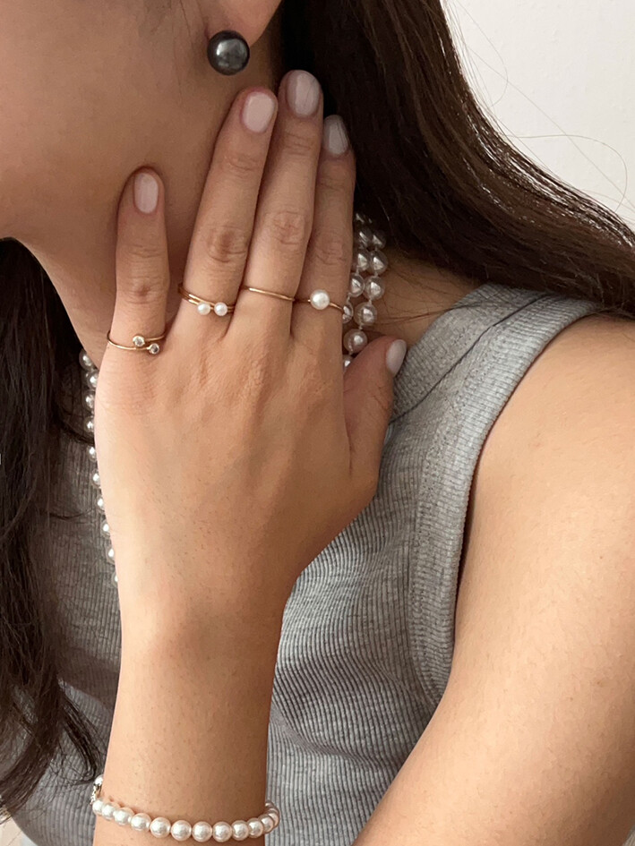 당연히 한손에 2-3피스 이상을 레이어링하면서 자유분방하고도 세련된 현대적 무드의 진주 스타일링을 도전해보세요.