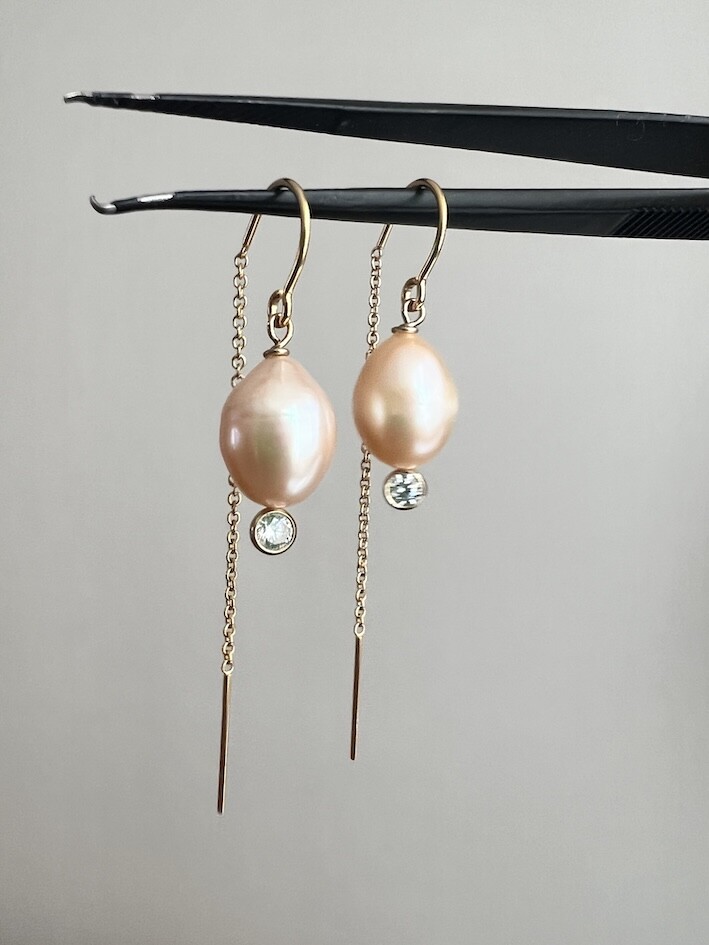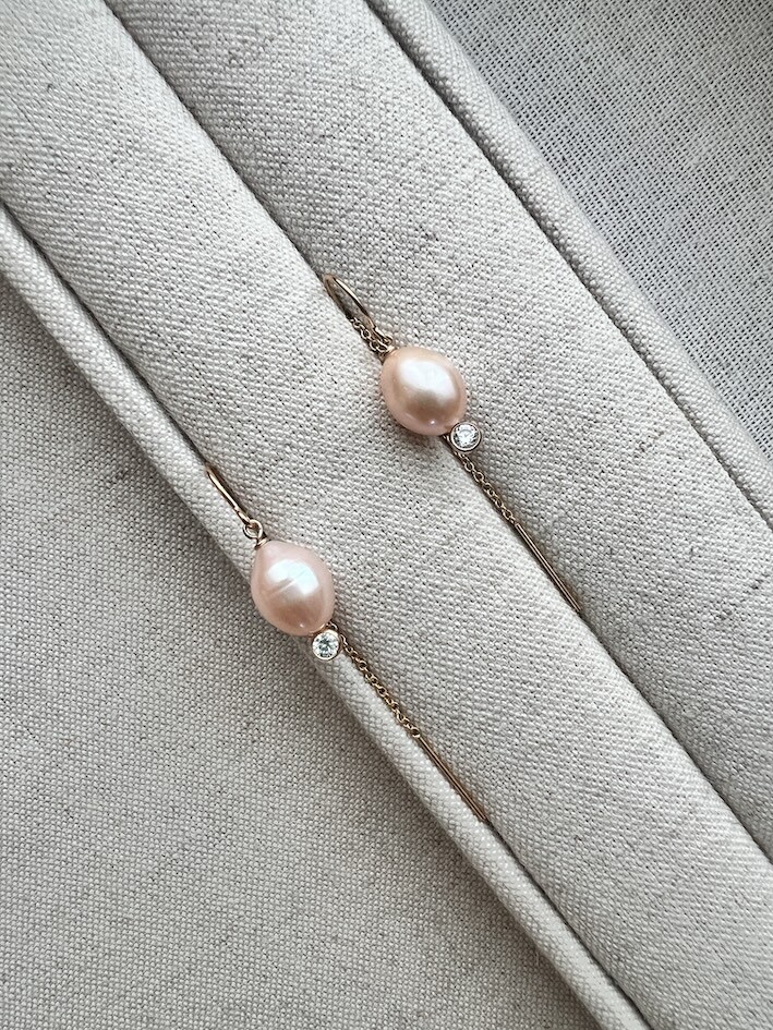 피치 핑크 컬러의 티어드랍 형태 담수진주로 만든 드랍형 귀걸이입니다.