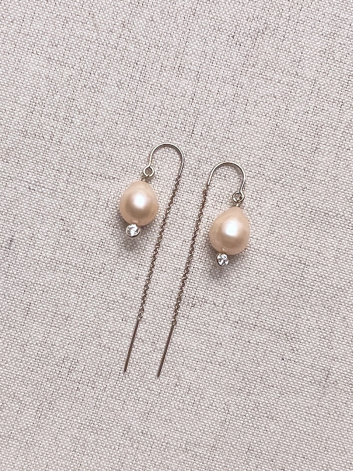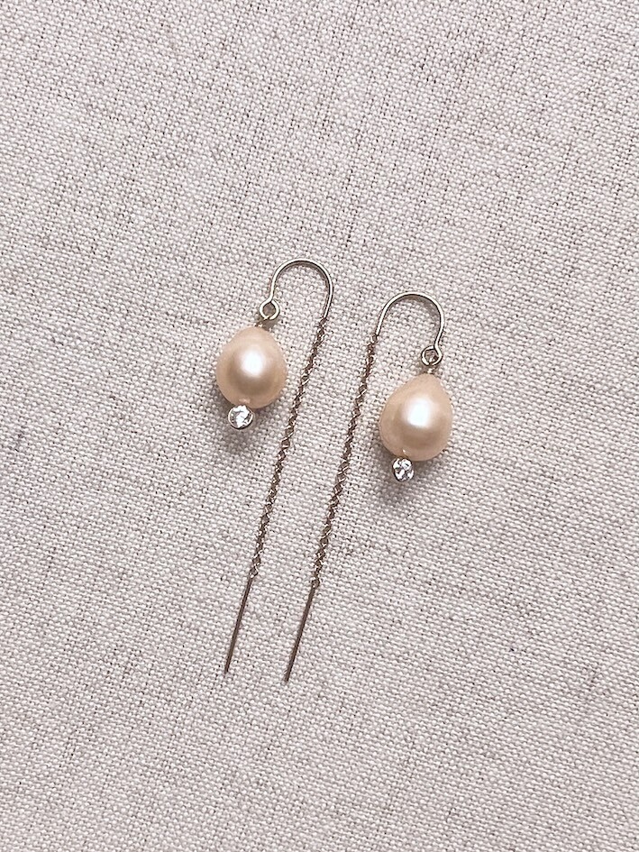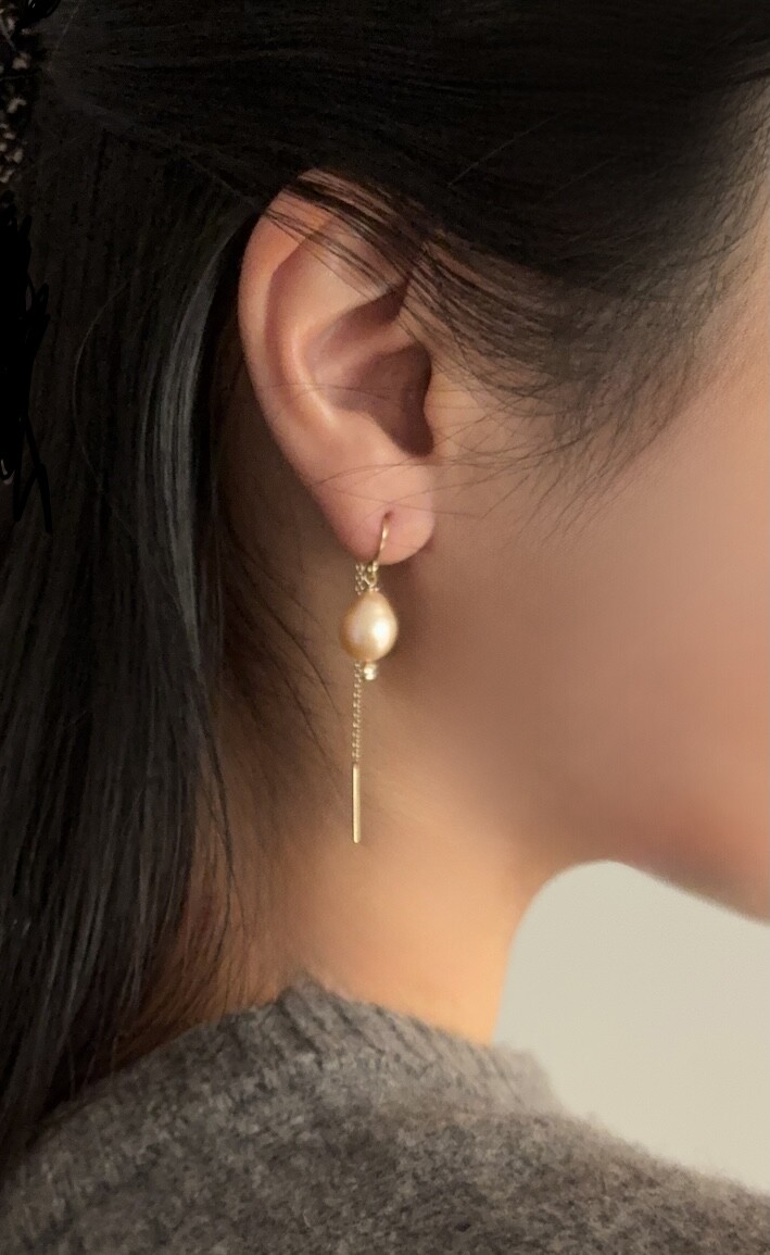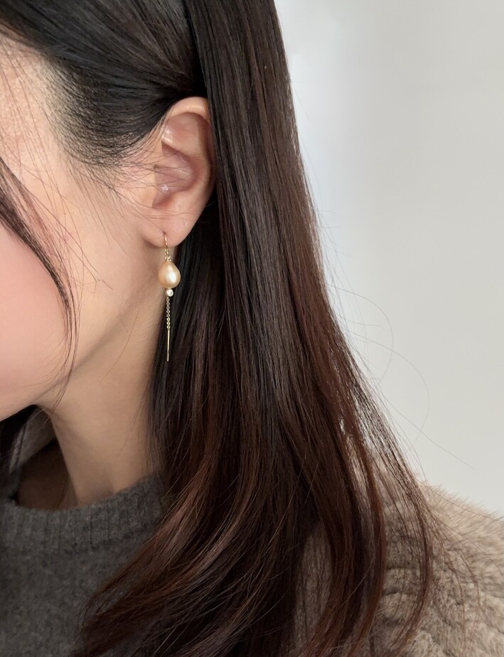 움직임에 따라 자연스럽게 진주 드랍이 흔들리면서 여성스럽고 아름다운 무드를 모여주는 귀걸이입니다.