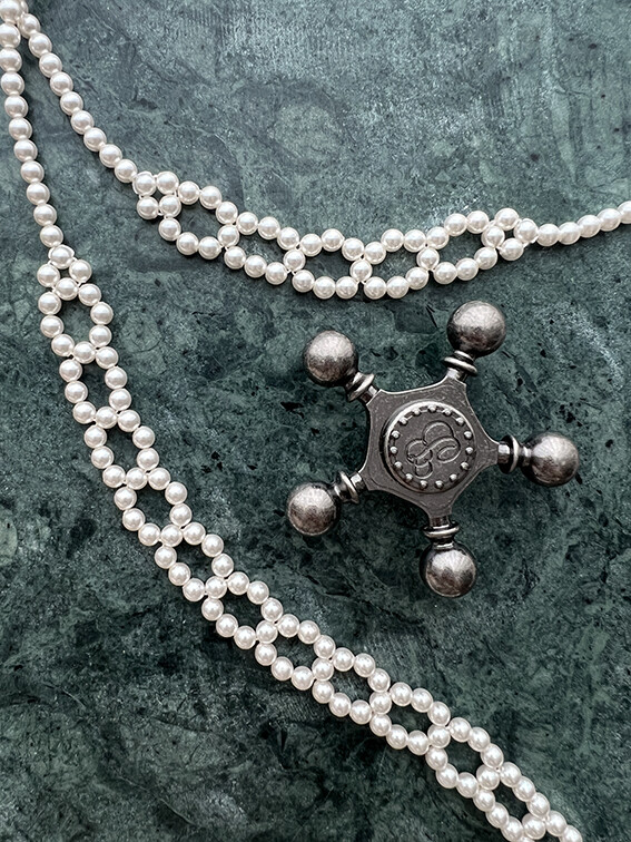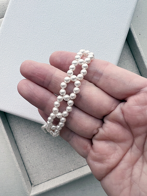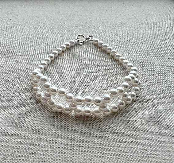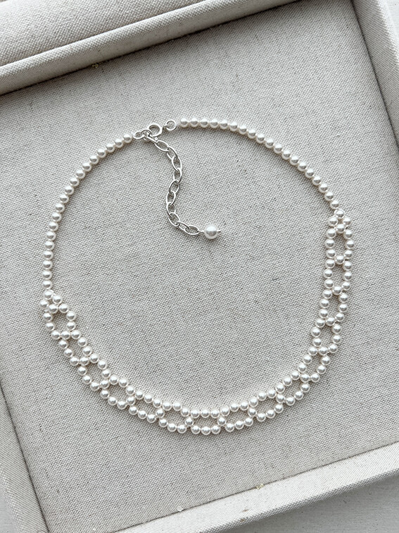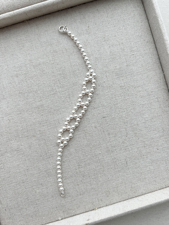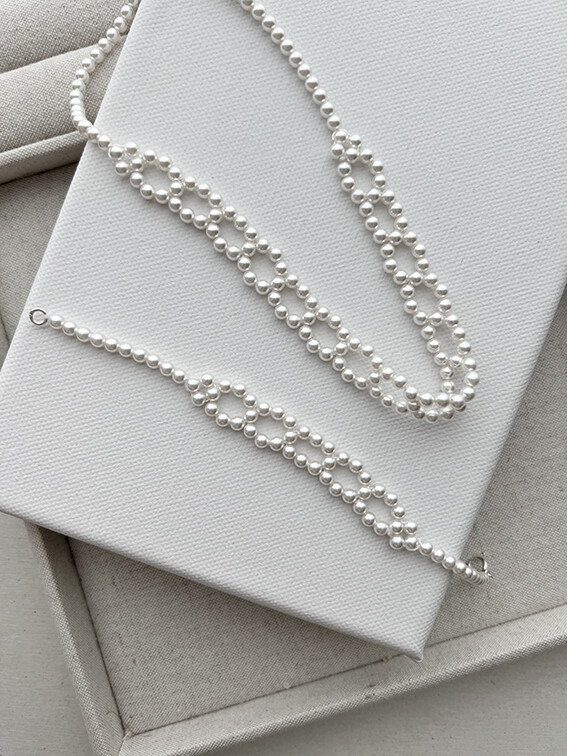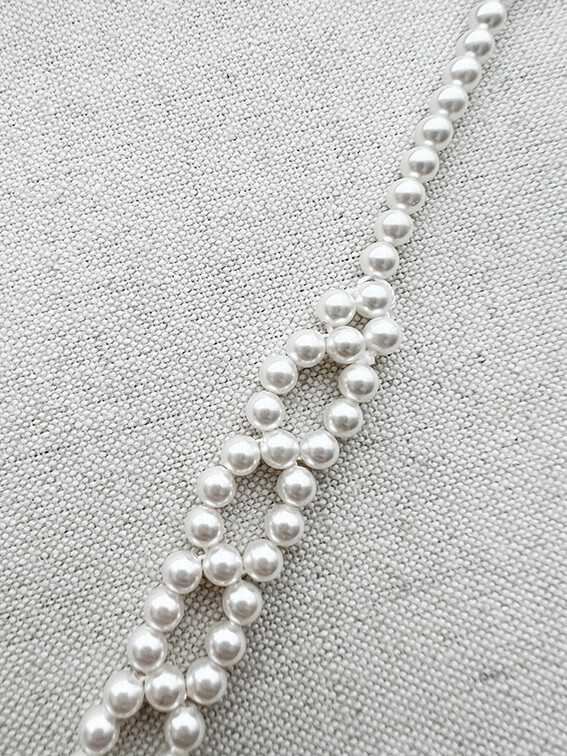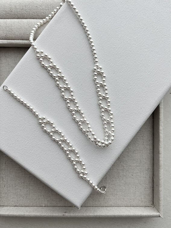 4mm 크기의 스와로브스키 진주를 명주실(실크실) 여러가닥으로 엮어 체인으로 구현했습니다.