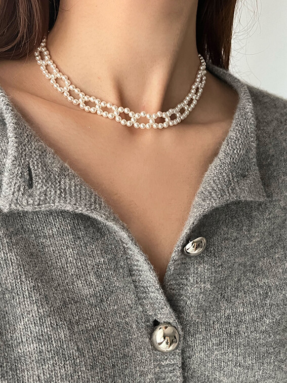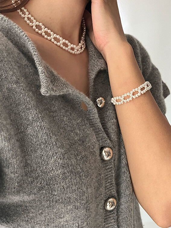 작은 사이즈의 진주들로 큰 형태의 체인을 만드는 디테일한 요소를 담고 있어 전체적으로 매우 고급스러운 분위기를 자아냅니다.