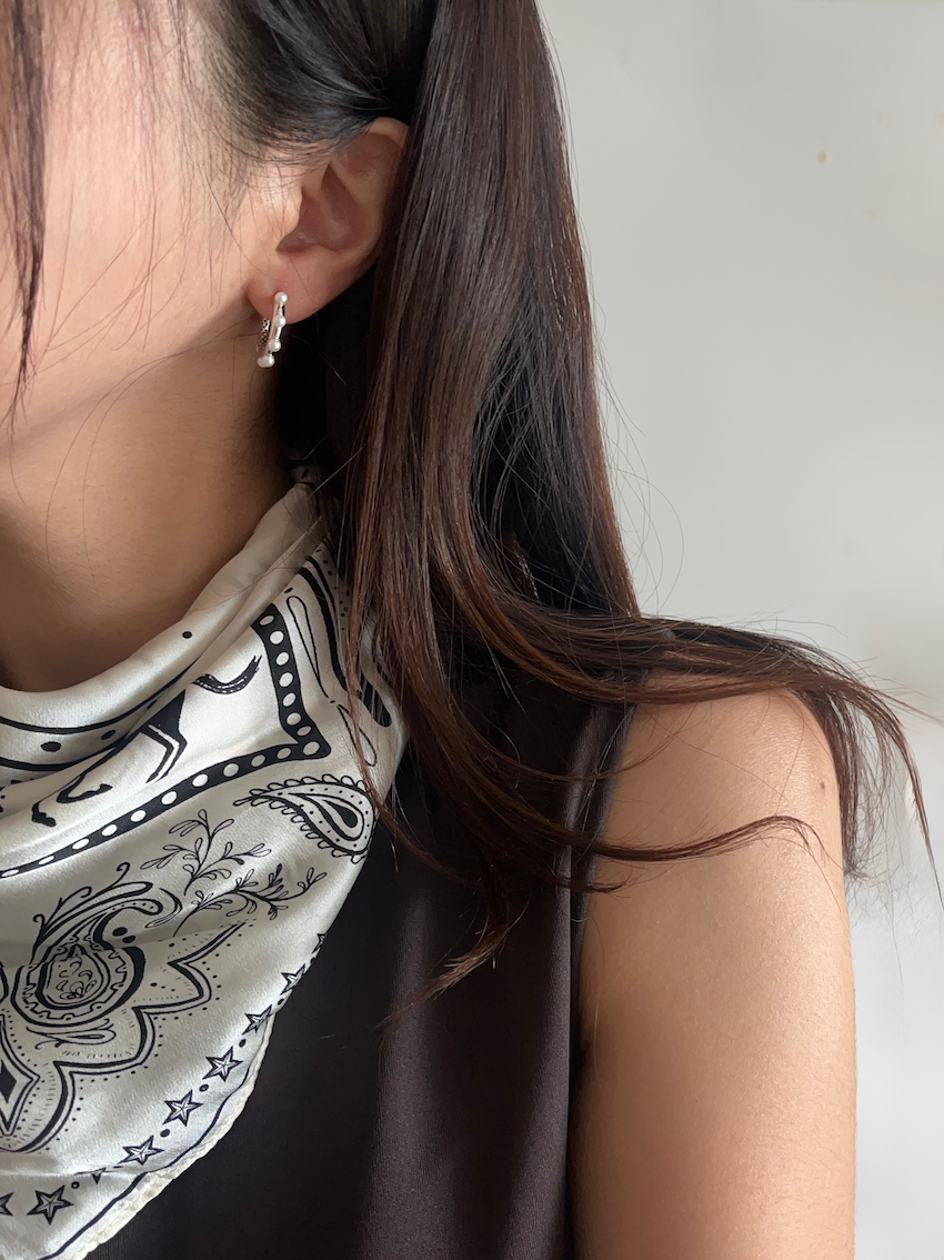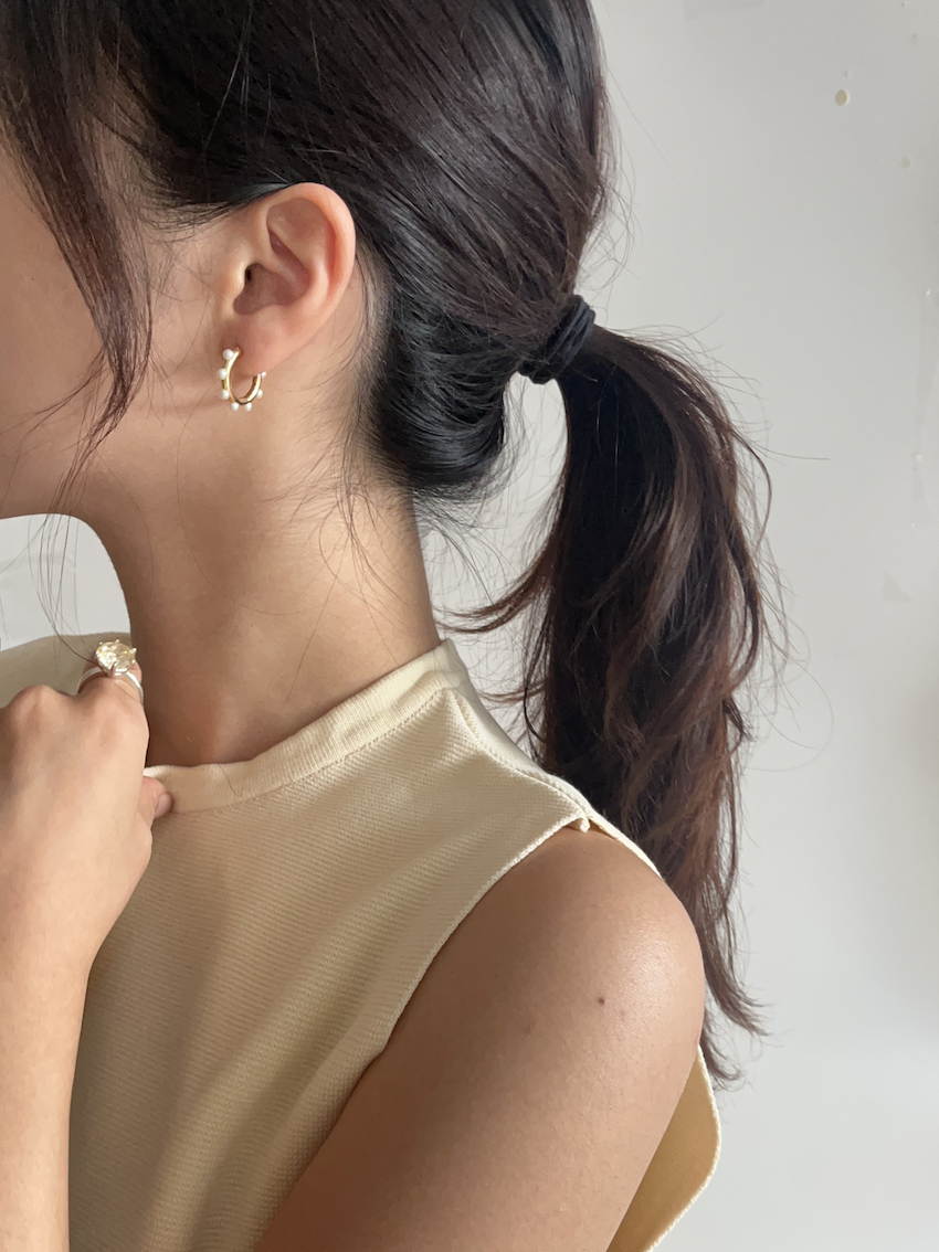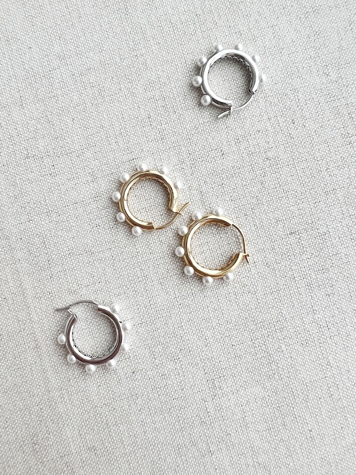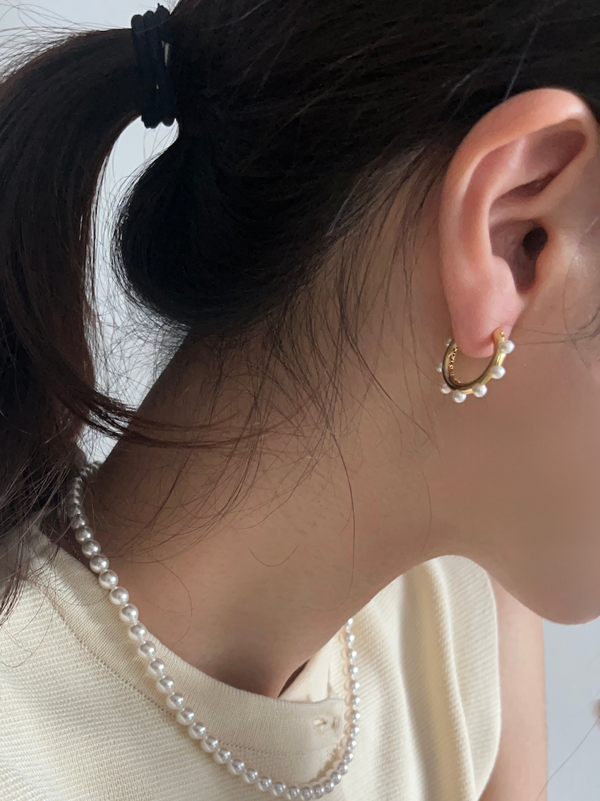 도톰한 볼륨이 있는 후프링에 진주를 더해 화려하고도 우아한 진주 귀걸이를 완성시켰습니다.