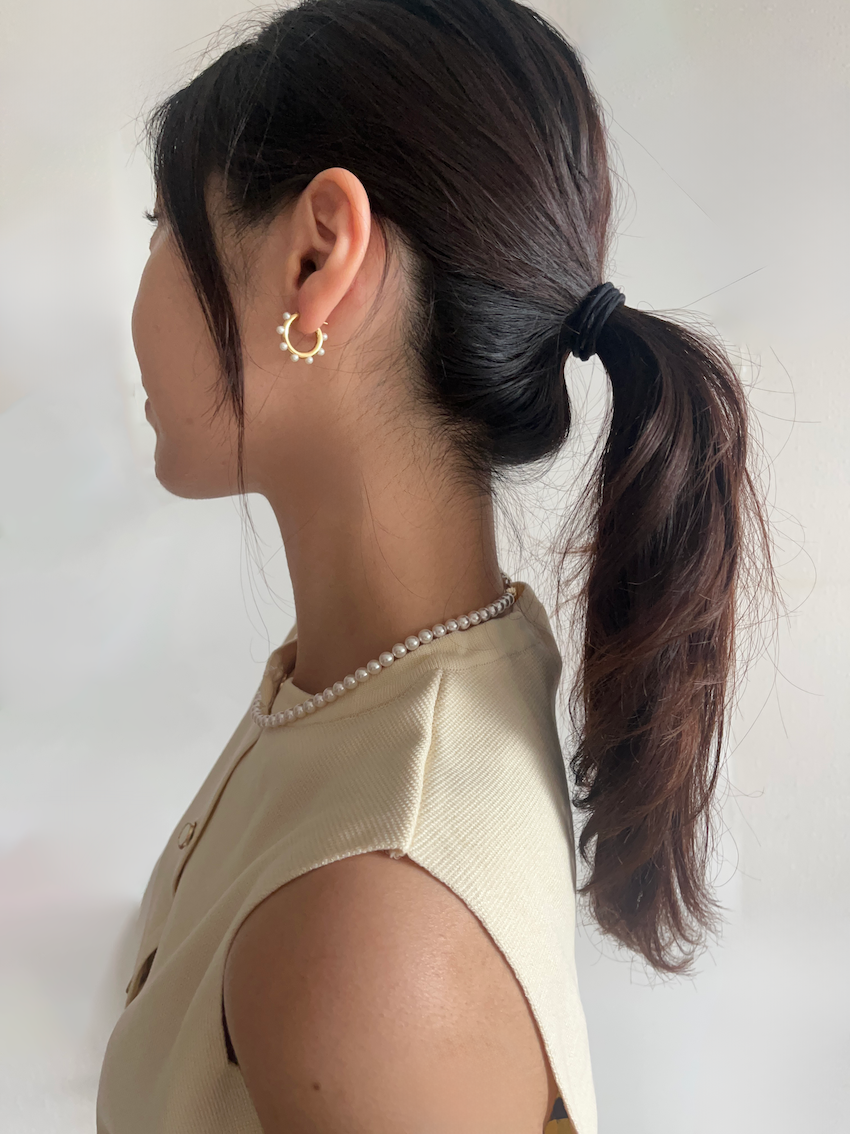 펄리글로우의 오랜 시그니처 후프링과 유사한 사이즈의 원터치 스타일 진주이어링입니다.