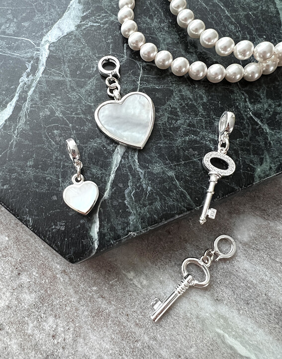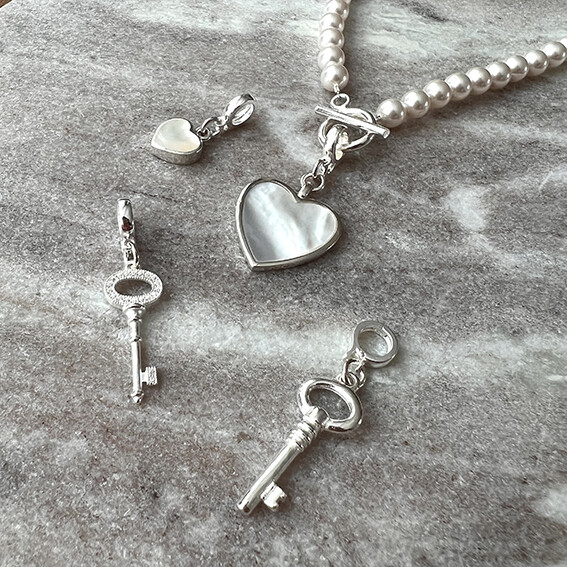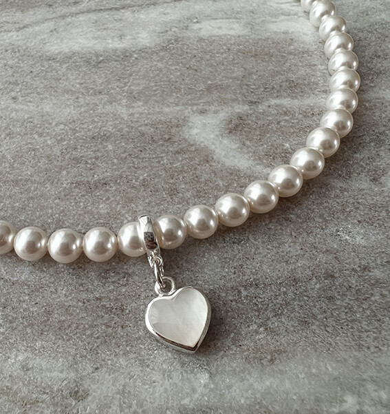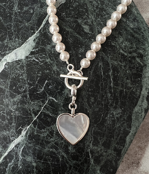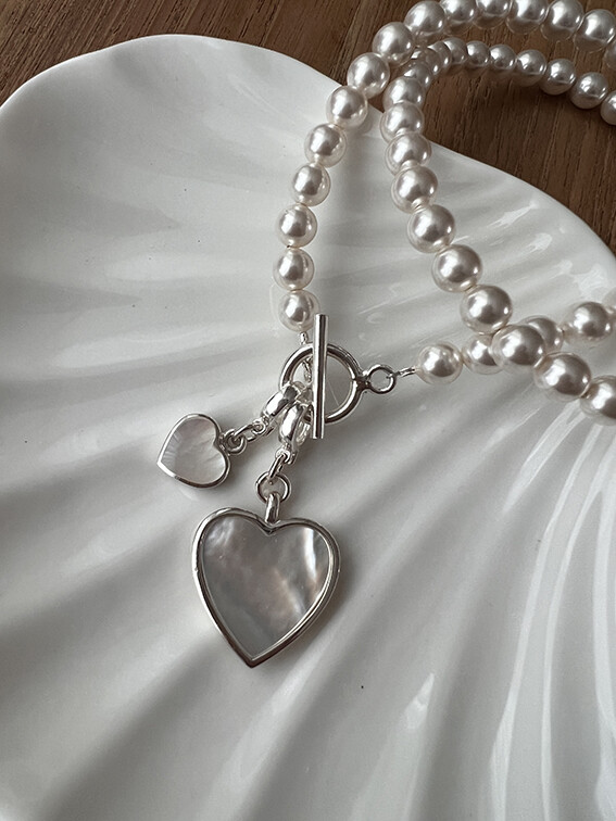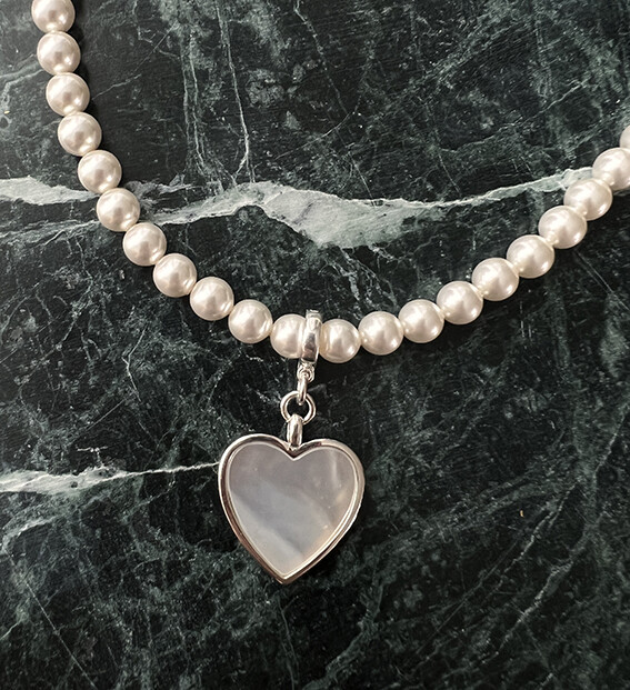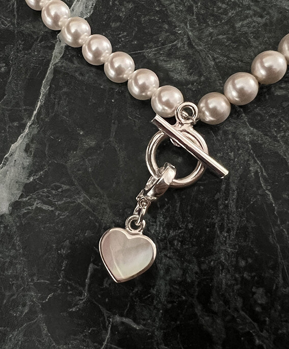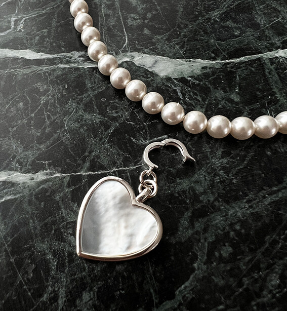 진주와 잘 어울리면서도 하나만으로도 이목이 집중될 수 있을만한 mother of pearl(자개)를 캐보션으로 물린 하트 팬던트가 그 주인공!!!