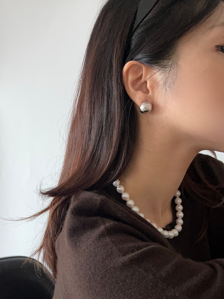 마찬가지로 완전한 볼 형태의 원터치 귀걸이로 착용시 귓볼을 자연스럽게 덮으면서 안정적인 구조를 보여주는 귀걸이입니다.