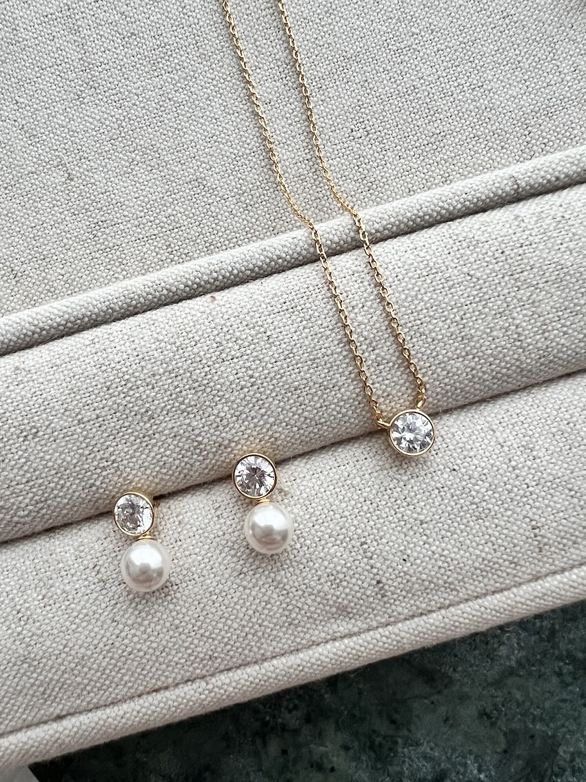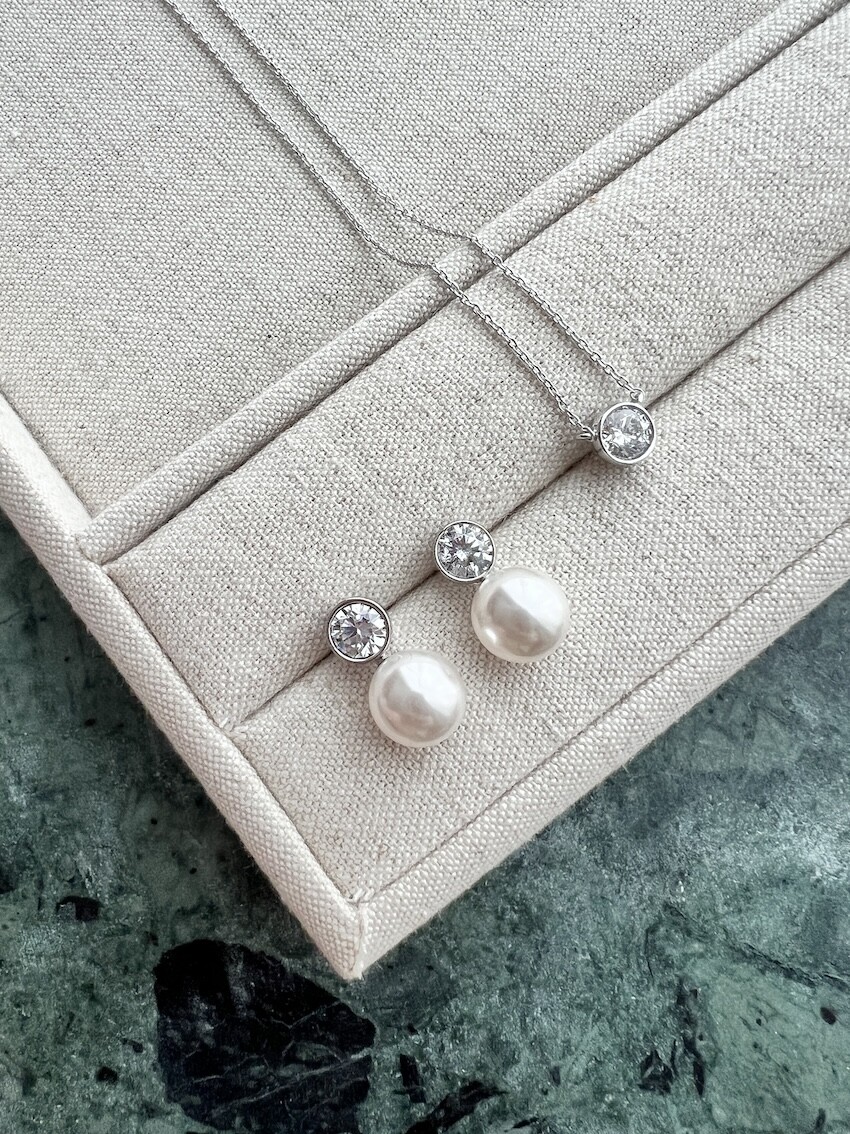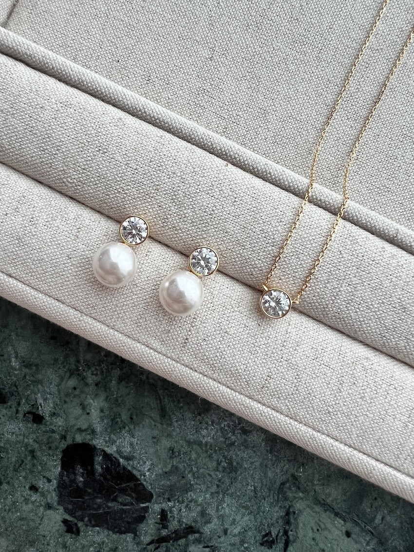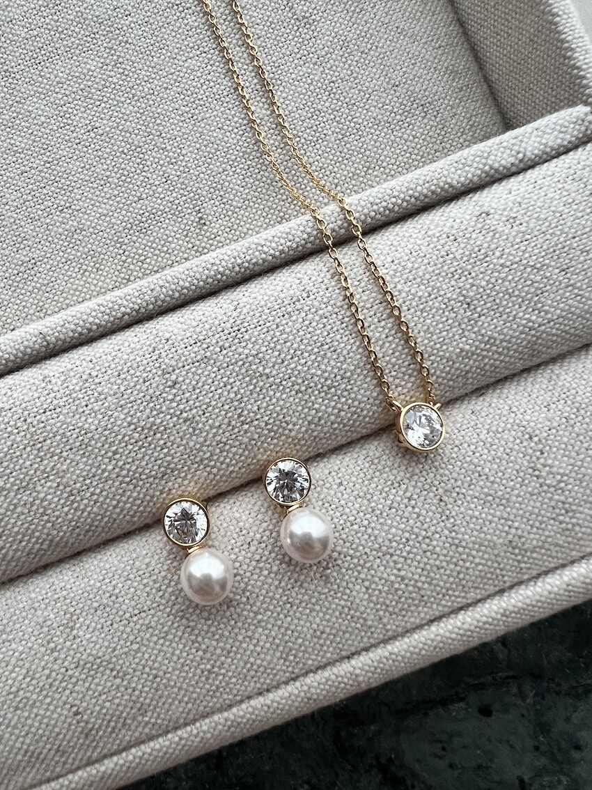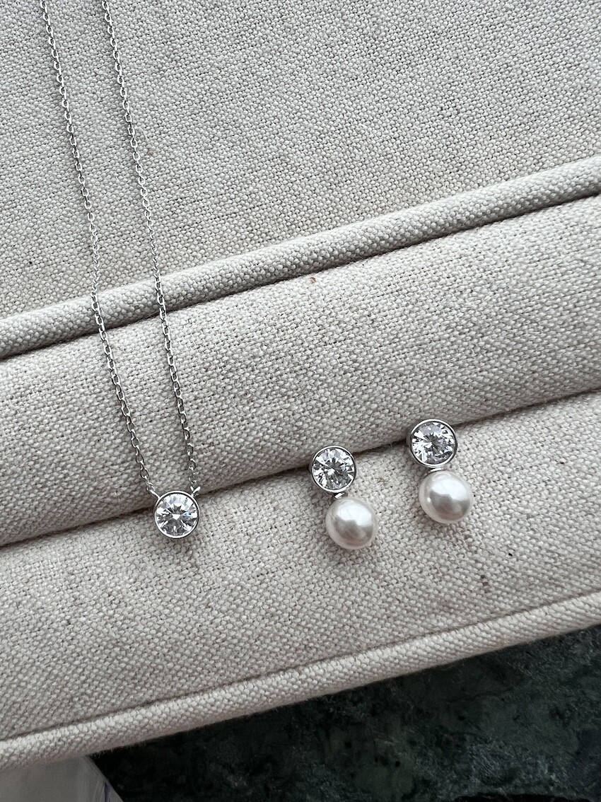 깨끗한 크리스탈과 진주의 만남으로 완벽한 조화를 이루는 귀걸이와 목걸이 세트 구성입니다.