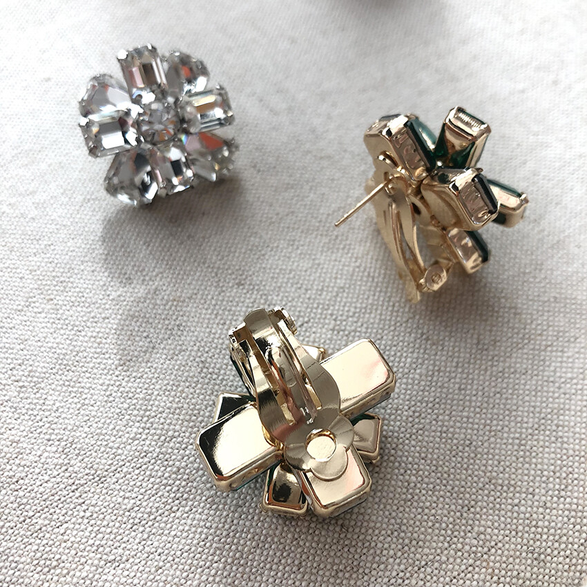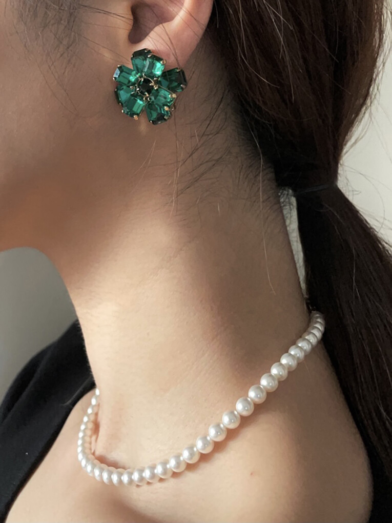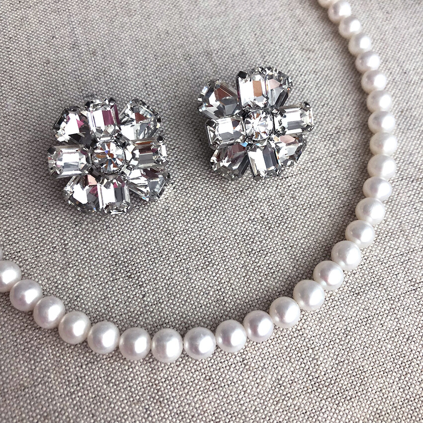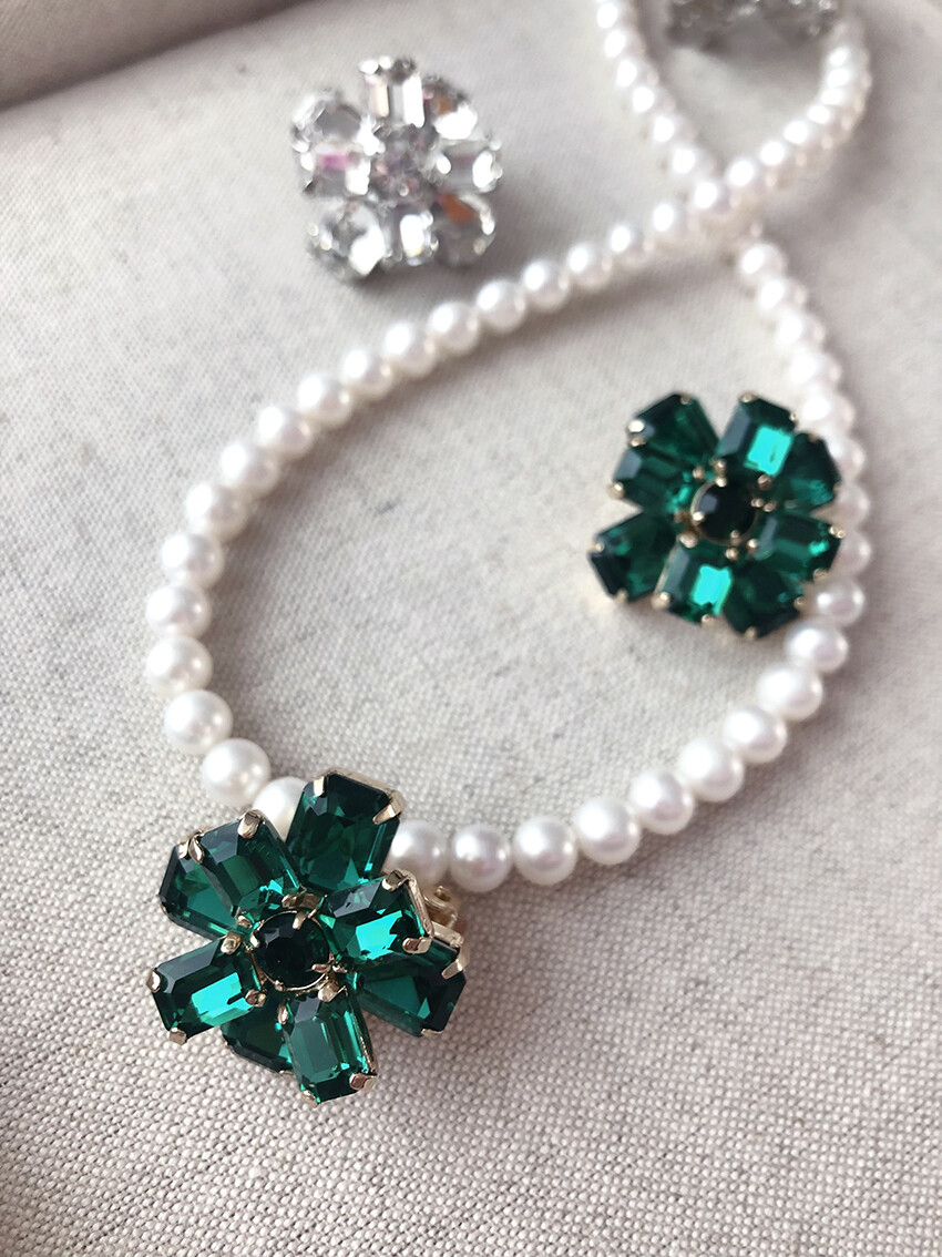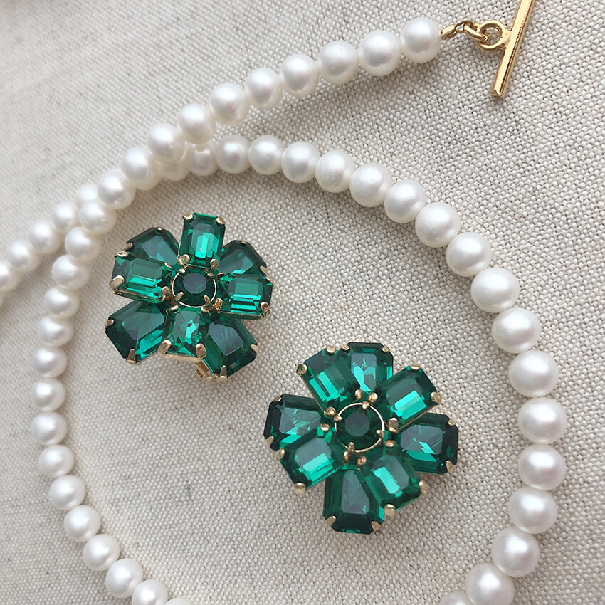 직사각형으로 컷팅된 크리스탈이 멋스럽고 빈티지한 매력을 보여주며, 착용했을때 화려한 꽃이 장착된 것 같은